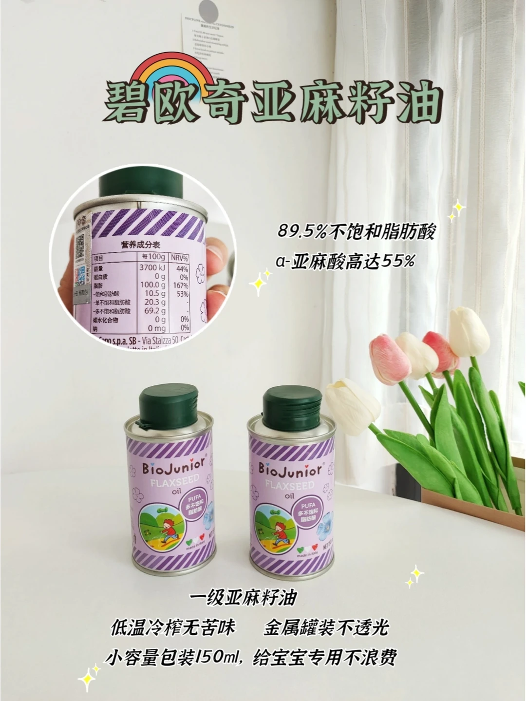 ▪️我家宝宝吃的是碧欧奇的核桃油和亚麻籽油,这两种油交替使用的,核桃油适合冷调,亚麻籽油可以热炒、蒸煮炖,烟点高达231℃,特殊加工工艺,这款亚麻籽油保留了营养的同时完全没有苦味呢,我给宝宝用这个油做辅食,每次都吃的特别香呢!麻麻们赶紧入手吧!
