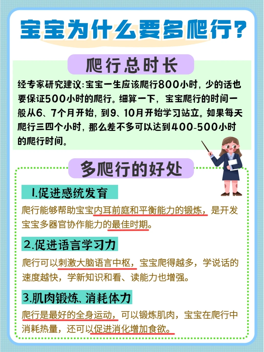 🟢1岁内,在宝宝成长过程中,爬行对宝宝来说是非常重要的,爬行少了会造成感统失调。所以我特别提醒各位新手妈妈们,宝宝学爬过程中,每天要爬够3-4小时,不要老是让家人抱着啦,一定要多爬!!。