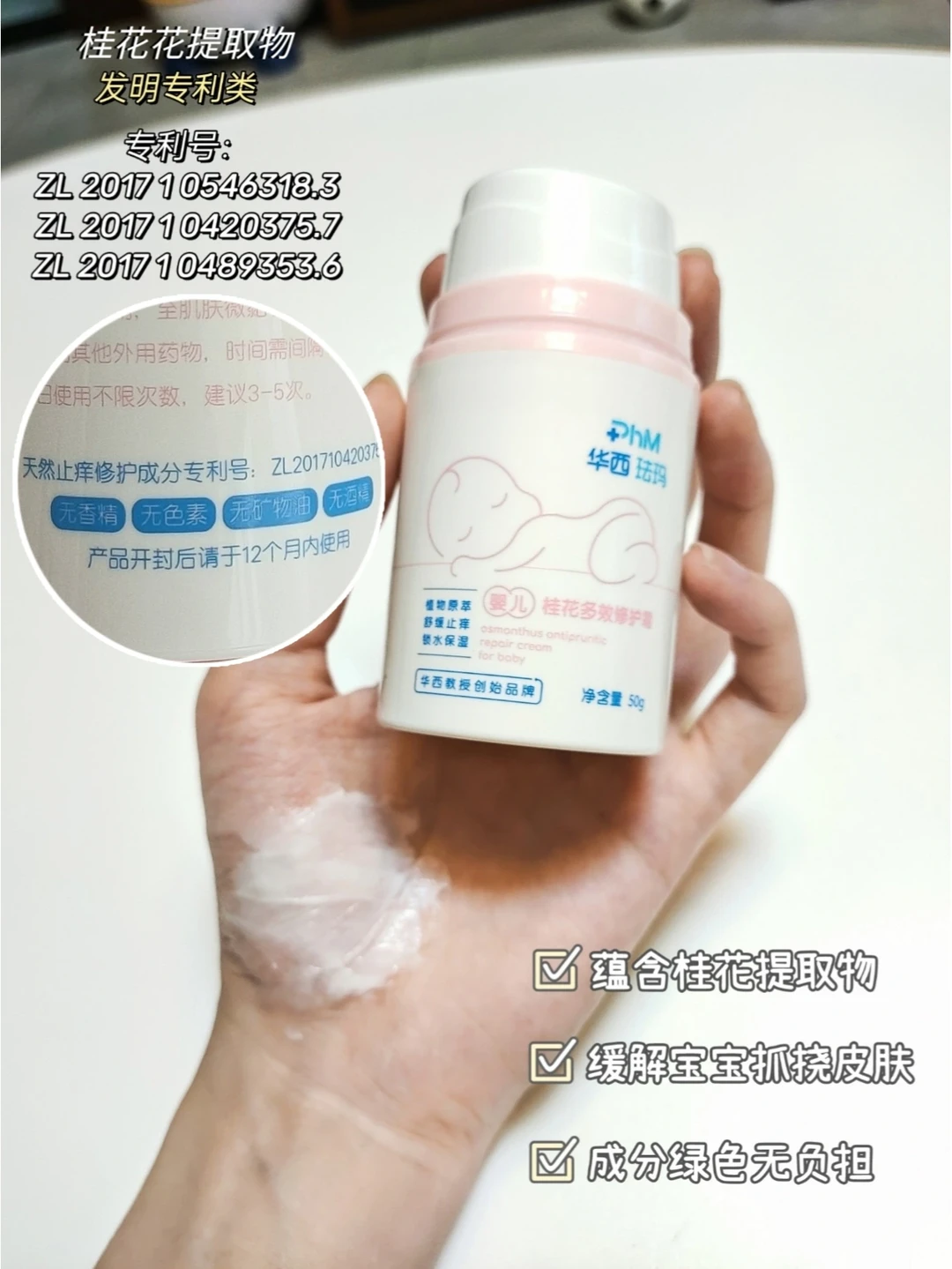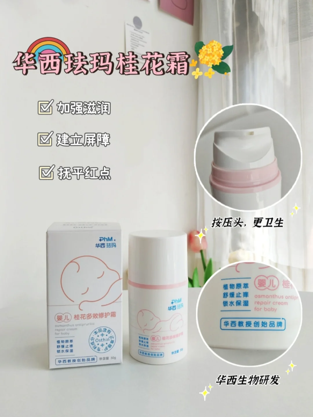 ⭐像我家宝宝,用过很多款风很大的面霜,但是使用下来,无功无过,不能处理宝宝皮肤问题,后来在妈妈群的高呼声下,入手了华西珐玛桂花霜,里面含桂花花提取物,可以缓宝宝抓脸现象,并且成分简单,没有香精、色素、酒精等杂七杂八的不友好,给宝宝用很安心的😏🥰