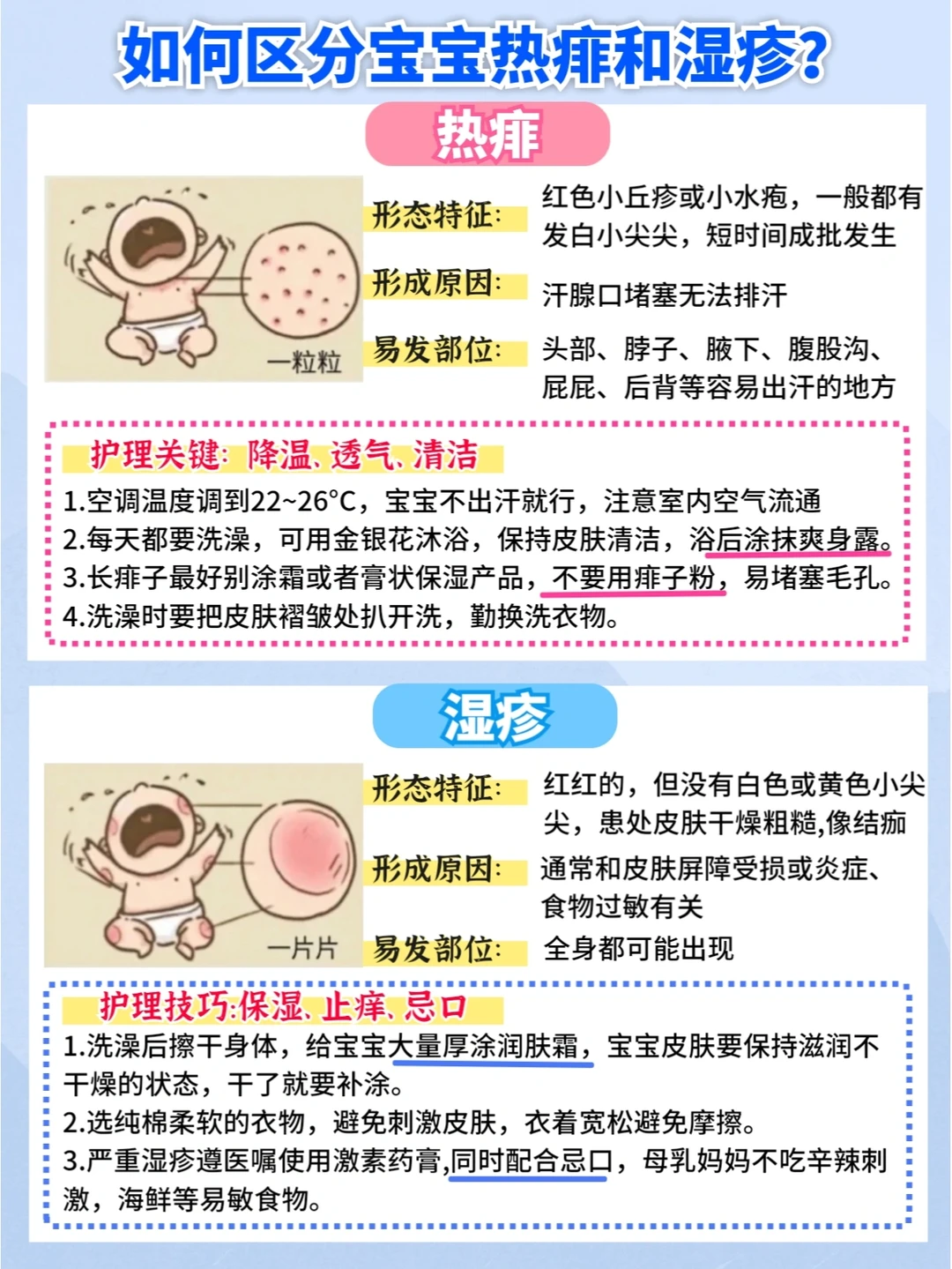 是一种常见的、由内外因素引起的过敏性皮肤问题。大多数宝宝在2-6个月时开始出现。先从两颊开始👉会逐渐扩散到颈部、耳后、躯干及四肢。遇热往往会加重,比如洗热水澡的时候。2岁后大多数宝宝会情况好转😇