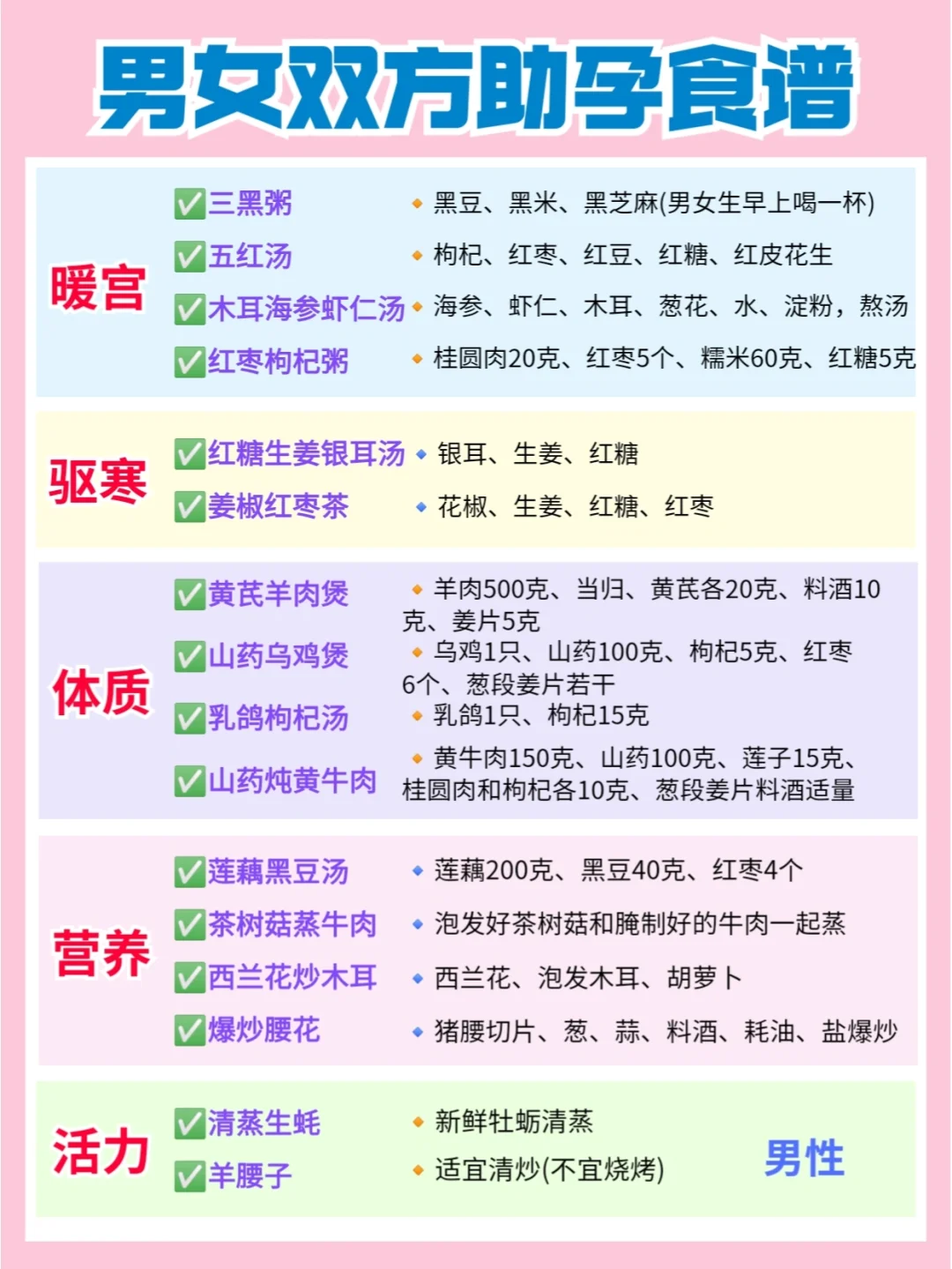 🔹4.暖宫:宫寒会影响受孕,每天可用少许艾叶泡脚,五红汤、双红汤可以都可以安排上。