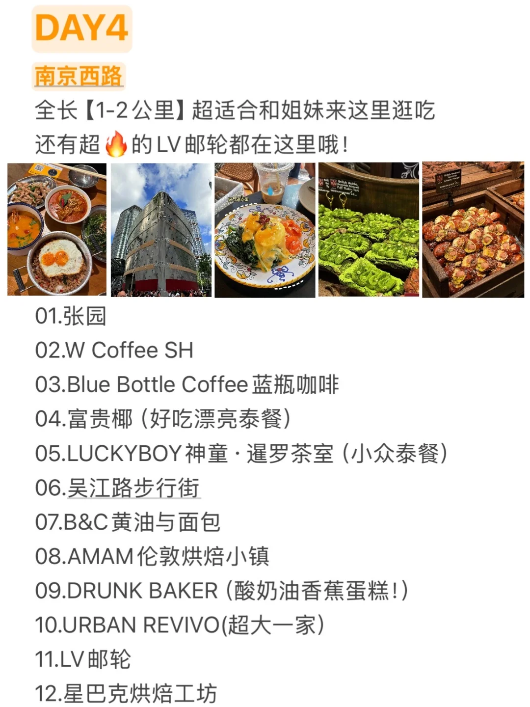 张园→W Coffee SH →Blue Bottle Coffee蓝瓶咖啡→富贵椰→LUCKYBOY神童→吴江路步行街→B&C黄油与面包→AMAM伦敦烘焙小镇→DRUNK BAKER→UR→LV邮轮→星巴克烘焙工坊