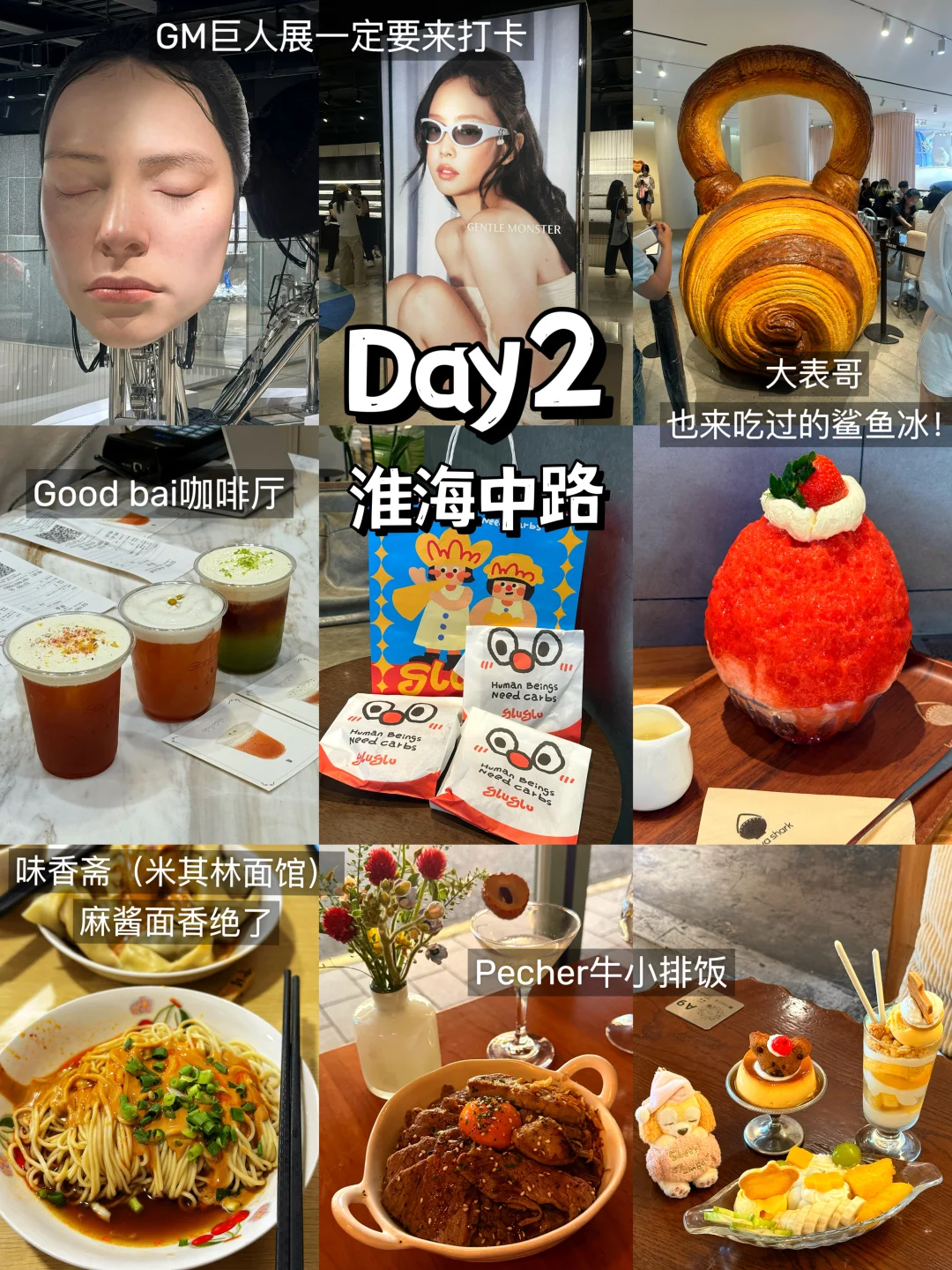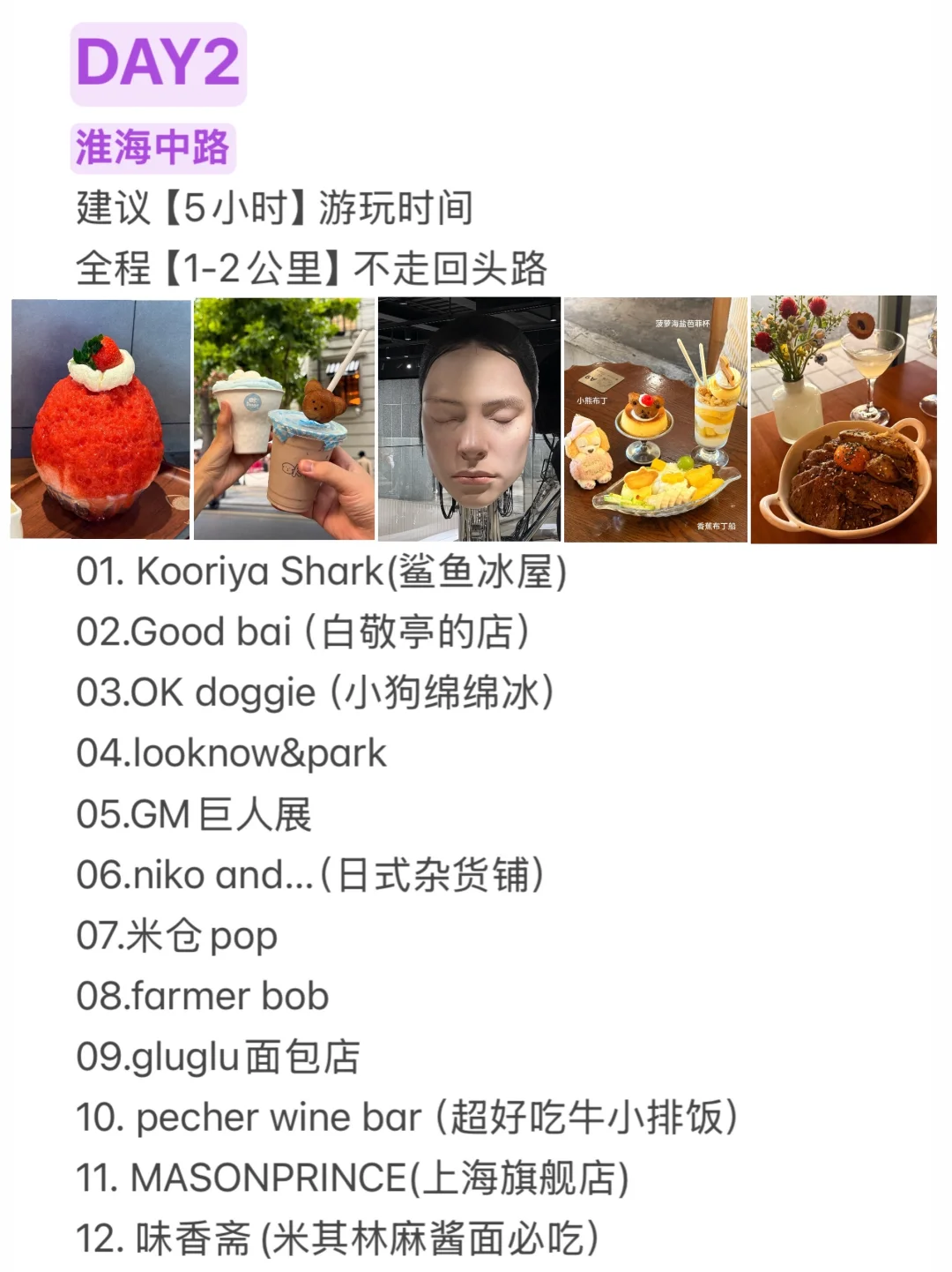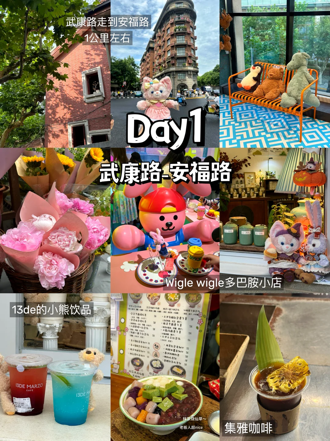 百代小楼→武康大楼→武康庭→birdie cup→wiggle wiggle→13de marzo(小熊咖啡)→bm服装店→多抓鱼循环店→looknow&flow→申经冰店(抹茶烧仙草)→路可闹公园(jellycat仓库)