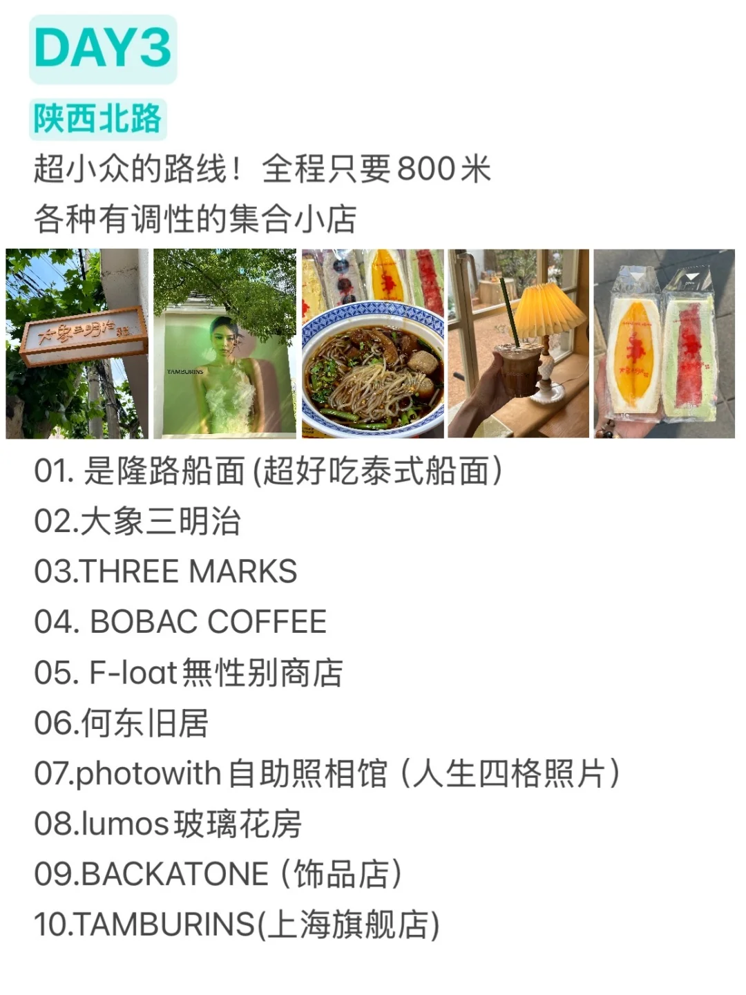 是隆路船面→大象三明治→THREE MARKS→BOBAC COFFEE→F-loat無性别商店→何东旧居(photowith自助照相馆/lumos玻璃花房/BACKATONE/TAMBURINS)