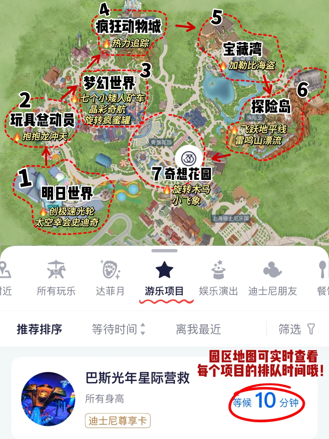 打开APP-地图,可实时查看每个项目的排队时间!早上优先刷园区热门项目,创极速光轮、热力追踪、飞越地平线,等候时间40分钟以下的赶紧去冲!