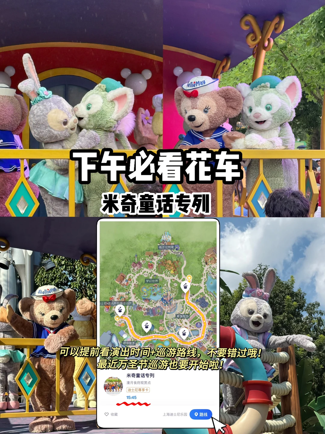 花车时间一般是下午12:15和15:45,点“地图”查看具体时间,还能看到花车的巡游路线!10月4起,18:30还能看到万圣夜间花车