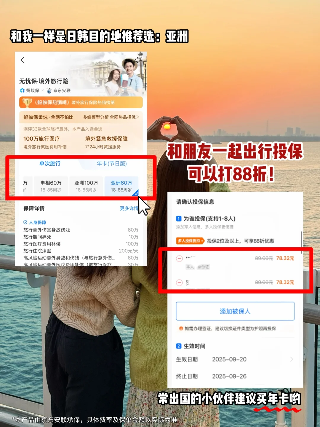 ✅姐妹2人一起投有88折优惠,境外出行买安心