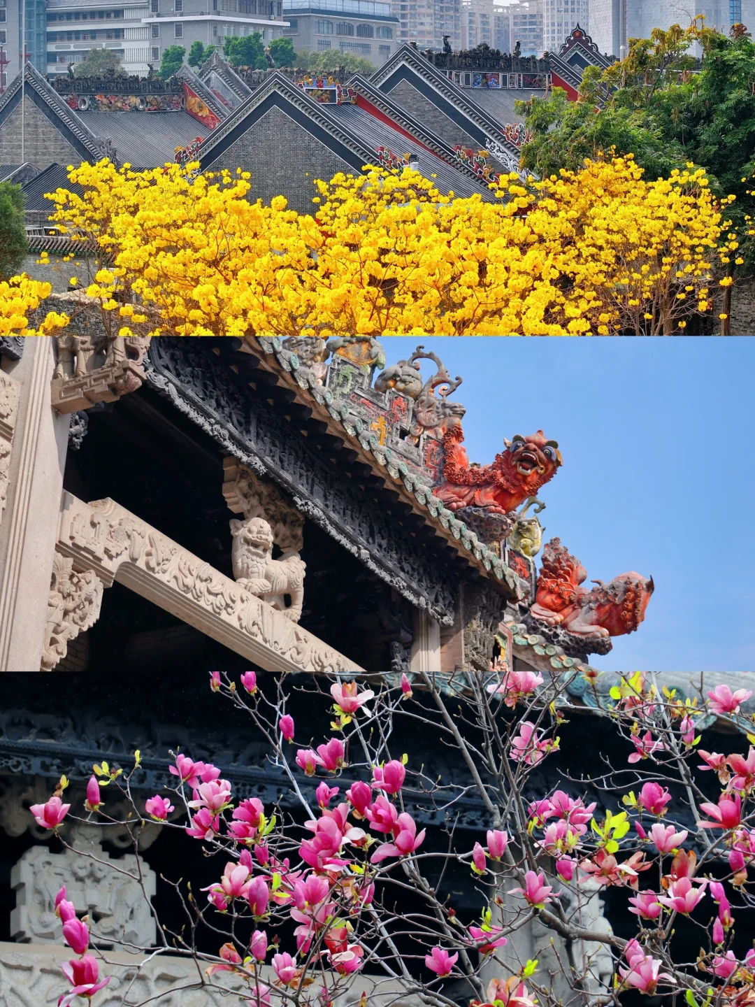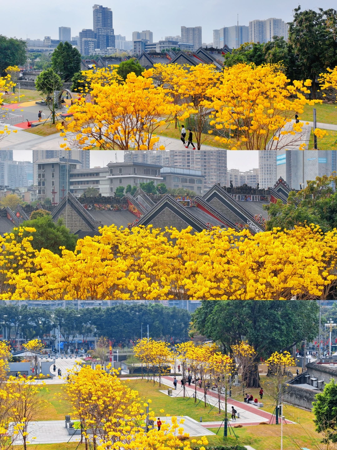 比起洲头咀公园的黄色风铃木河堤 我更爱陈家祠广场的国风黄色风铃木 黄色风铃木搭配百年古祠,是中国人才懂的东方美学 - 📸游玩小tips 1️⃣黄色风铃木是今天(2.19)实拍图,新开放的陈家祠广场,黄色风铃木正是盛花期,草坪位置很是宽敞,想拍人像的小伙伴来这儿更适合仰拍全屏花海人像。 广场上还有粉色绣球花、格桑花可以拍照 2️⃣除了赏花,陈家祠也很值得去逛逛,祠堂在装饰上把木雕、石雕、砖雕、陶塑、灰塑、铸铁等工艺共冶一炉,将岭南地区的山川名胜、风土人情唯妙唯俏的展现在屋顶上,连郭沫若都赞叹不已:“天工人可代,人工天不如。果然造世界,胜读十年书。” 3️⃣陈家祠祠堂院里的玉兰花目前还未开,图片是去年的,很是期待今年花开呢 4️⃣附近的西华路、长寿路有许多老字号美食店,游玩累了还可以去吃点西关美食 - 🚇地铁1/8号线陈家祠D出口