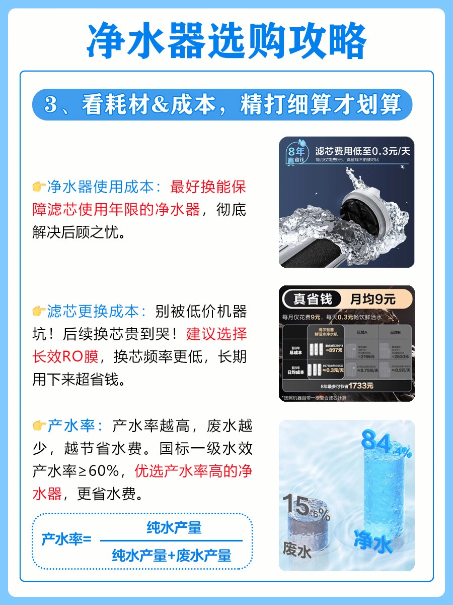 👉🏻国标一级水效产水率≥60%,优选产水率高的净水器,更省水费