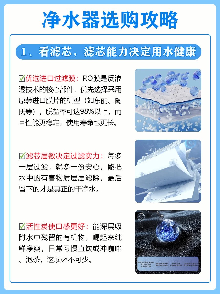 1️⃣看滤芯,RO膜滤芯净化能力更强