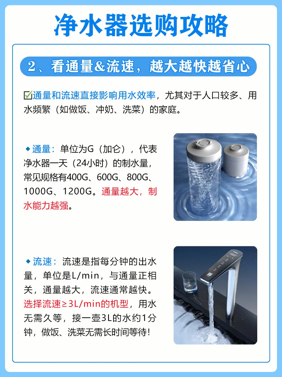 ✅选择流速≥3L/min 的机型,做饭、洗菜无需长时间等待