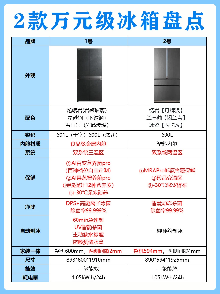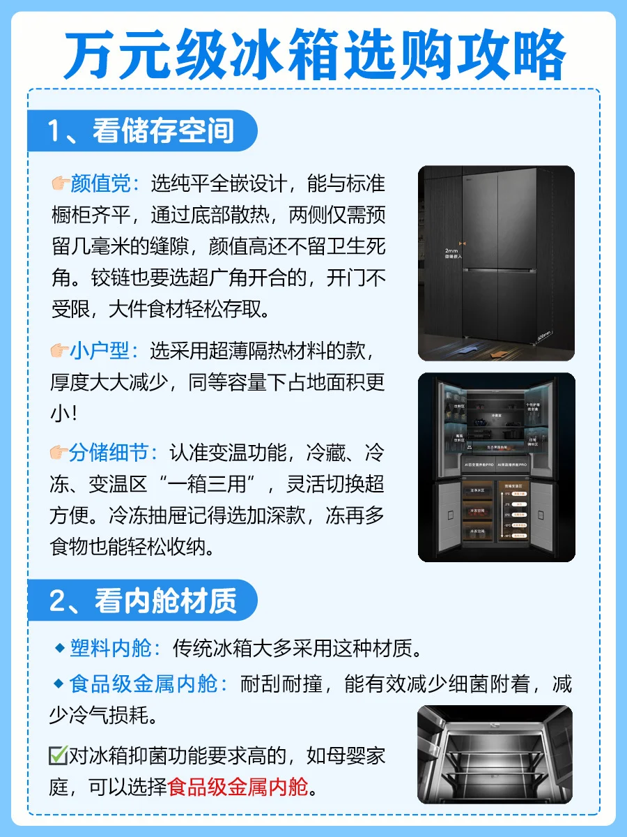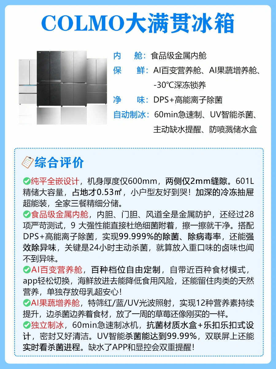 新家装修到选冰箱环节真的头大!尤其预算上了万,总怕花冤枉钱买错款。📝整理了 6 个核心选购要点,照着选准没错~ 1️⃣看储存空间 2️⃣看内舱材质 3️⃣看除菌技术 4️⃣看食材保鲜 5️⃣看自动制冰 🤩对比了两款万元级热门冰箱,两款各有优点,我选择的是1号COLMO大满贯冰箱~ ✨品牌1号 ✅纯平全嵌设计,机身厚度仅600mm,两侧仅2mm缝隙。601L精储大容量,占地才0.53㎡,小户型友好到哭!加深的冷冻抽屉超能装,全家三餐精细分储。 ✅食品级金属内舱,内胆、门胆、风道全是金属防护,还经过28 项严苛测试,9 大强性能直接杜绝细菌附着,擦一擦就干净。搭配DPS+高能离子除菌,实现99.999%的除菌、除病毒率,还能强效除异味,关键是24小时主动杀菌,就算放入重口味的卤味也闻不到异味。 ✅AI百变营养舱,百种档位自由定制,自带近百种食材模式,app轻松切换,海鲜放进去能降低食用风险,还能留住肉类的天然营养,单独存放母乳超安心! ✅AI果蔬增养舱,特筛红/蓝/UV光波照射,实现12种营养素持续提升,边杀菌边养着食材,放了一周的草莓还像刚买的一样。 ✅独立制冰,60min急速制冰机,抗菌材质水盒+乐扣乐扣式设计,密封又好清洁。UV智能杀菌能达到99.99%,双联屏上还能实时看杀菌进程。缺水了APP和显控会双重提醒! ✨品牌2号 ✅超薄零嵌设计,机身厚度仅594mm,搭配底部前置散热技术,两侧可与橱柜实现 0cm 无缝贴合。 ✅婴爱专属空间,支持三档变温调节,提供珍品、母婴、0℃保鲜三种精准温控模式。 ✅MRAPro低氣窖藏保鲜,通过营造低氧轻呼吸环境,有效减缓食物氧化进程。果蔬在冷藏 7 天后仍能保持水润口感。 ✅冷冻-30℃深冷智冻,以超低温瞬冻技术快速锁住食材活性,海鲜、肉类等冷冻后依旧保持鲜美红润色泽,解冻后肉质紧实不泛白、不发柴,还原食材本真风味。 ✅智慧动态除菌净化技术,实时监控舱内环境,主动感知食材存储状态变化,实现除病毒、除菌、净味、防霉菌、降农残、除乙烯。