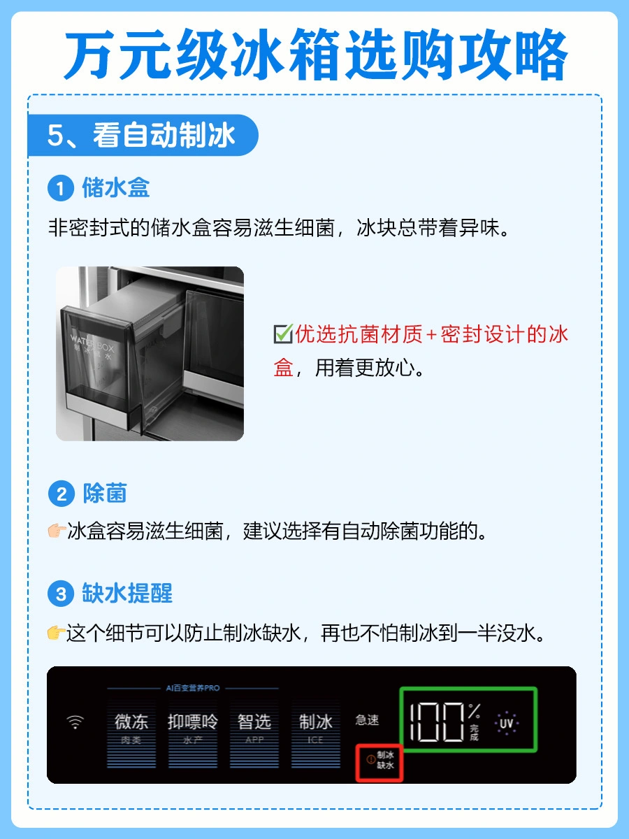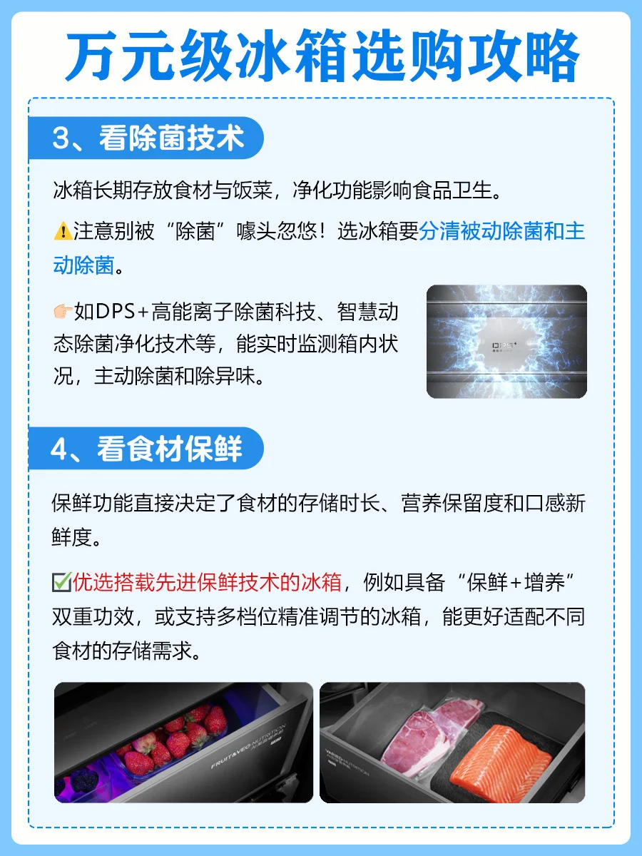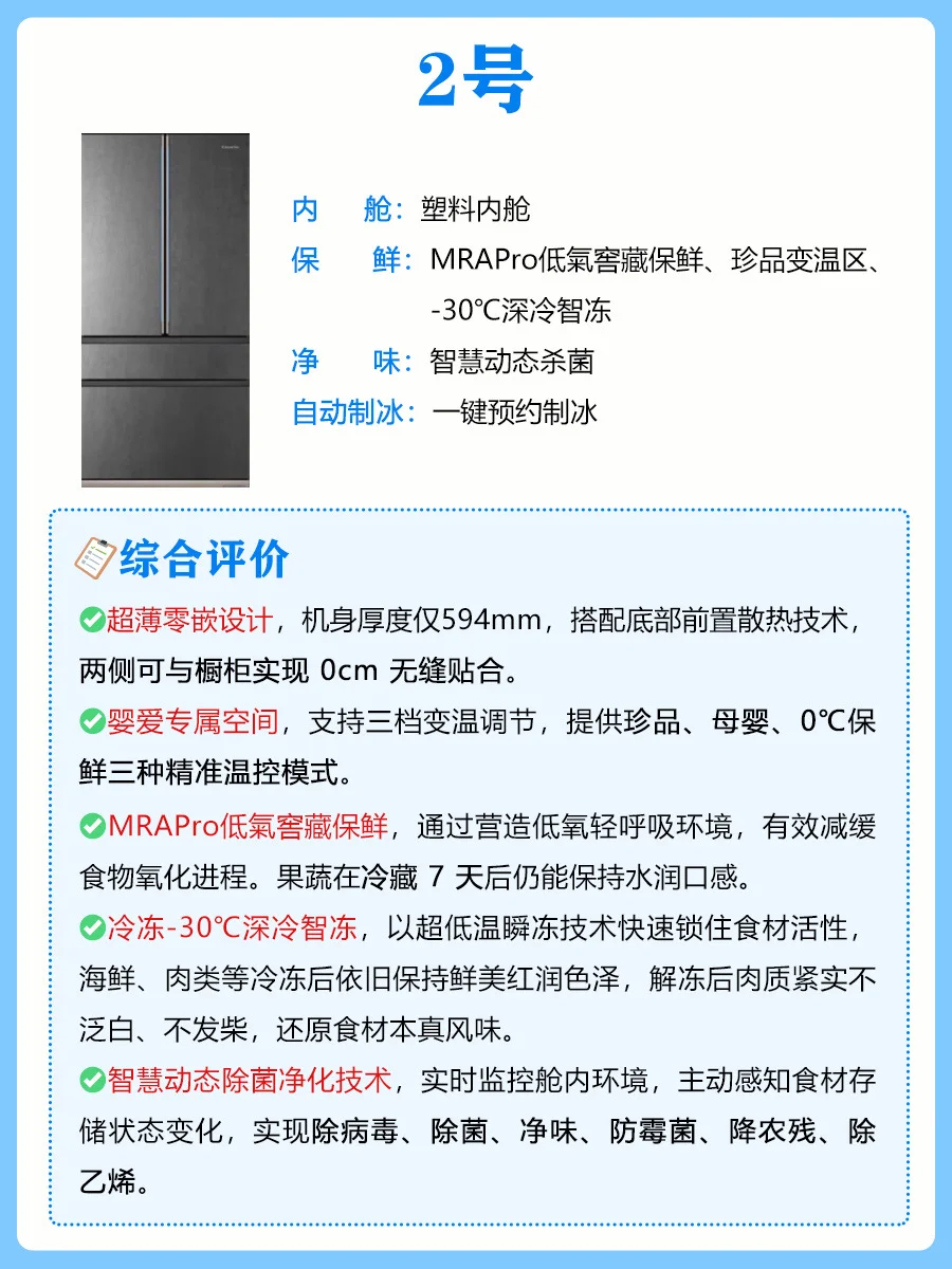 新家装修到选冰箱环节真的头大!尤其预算上了万,总怕花冤枉钱买错款。📝整理了 6 个核心选购要点,照着选准没错~ 1️⃣看储存空间 2️⃣看内舱材质 3️⃣看除菌技术 4️⃣看食材保鲜 5️⃣看自动制冰 🤩对比了两款万元级热门冰箱,两款各有优点,我选择的是1号COLMO大满贯冰箱~ ✨品牌1号 ✅纯平全嵌设计,机身厚度仅600mm,两侧仅2mm缝隙。601L精储大容量,占地才0.53㎡,小户型友好到哭!加深的冷冻抽屉超能装,全家三餐精细分储。 ✅食品级金属内舱,内胆、门胆、风道全是金属防护,还经过28 项严苛测试,9 大强性能直接杜绝细菌附着,擦一擦就干净。搭配DPS+高能离子除菌,实现99.999%的除菌、除病毒率,还能强效除异味,关键是24小时主动杀菌,就算放入重口味的卤味也闻不到异味。 ✅AI百变营养舱,百种档位自由定制,自带近百种食材模式,app轻松切换,海鲜放进去能降低食用风险,还能留住肉类的天然营养,单独存放母乳超安心! ✅AI果蔬增养舱,特筛红/蓝/UV光波照射,实现12种营养素持续提升,边杀菌边养着食材,放了一周的草莓还像刚买的一样。 ✅独立制冰,60min急速制冰机,抗菌材质水盒+乐扣乐扣式设计,密封又好清洁。UV智能杀菌能达到99.99%,双联屏上还能实时看杀菌进程。缺水了APP和显控会双重提醒! ✨品牌2号 ✅超薄零嵌设计,机身厚度仅594mm,搭配底部前置散热技术,两侧可与橱柜实现 0cm 无缝贴合。 ✅婴爱专属空间,支持三档变温调节,提供珍品、母婴、0℃保鲜三种精准温控模式。 ✅MRAPro低氣窖藏保鲜,通过营造低氧轻呼吸环境,有效减缓食物氧化进程。果蔬在冷藏 7 天后仍能保持水润口感。 ✅冷冻-30℃深冷智冻,以超低温瞬冻技术快速锁住食材活性,海鲜、肉类等冷冻后依旧保持鲜美红润色泽,解冻后肉质紧实不泛白、不发柴,还原食材本真风味。 ✅智慧动态除菌净化技术,实时监控舱内环境,主动感知食材存储状态变化,实现除病毒、除菌、净味、防霉菌、降农残、除乙烯。