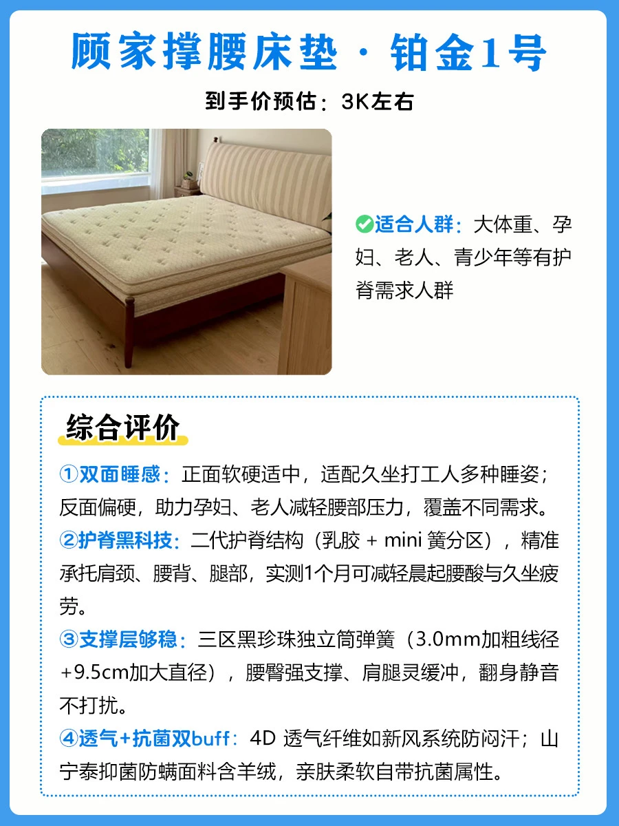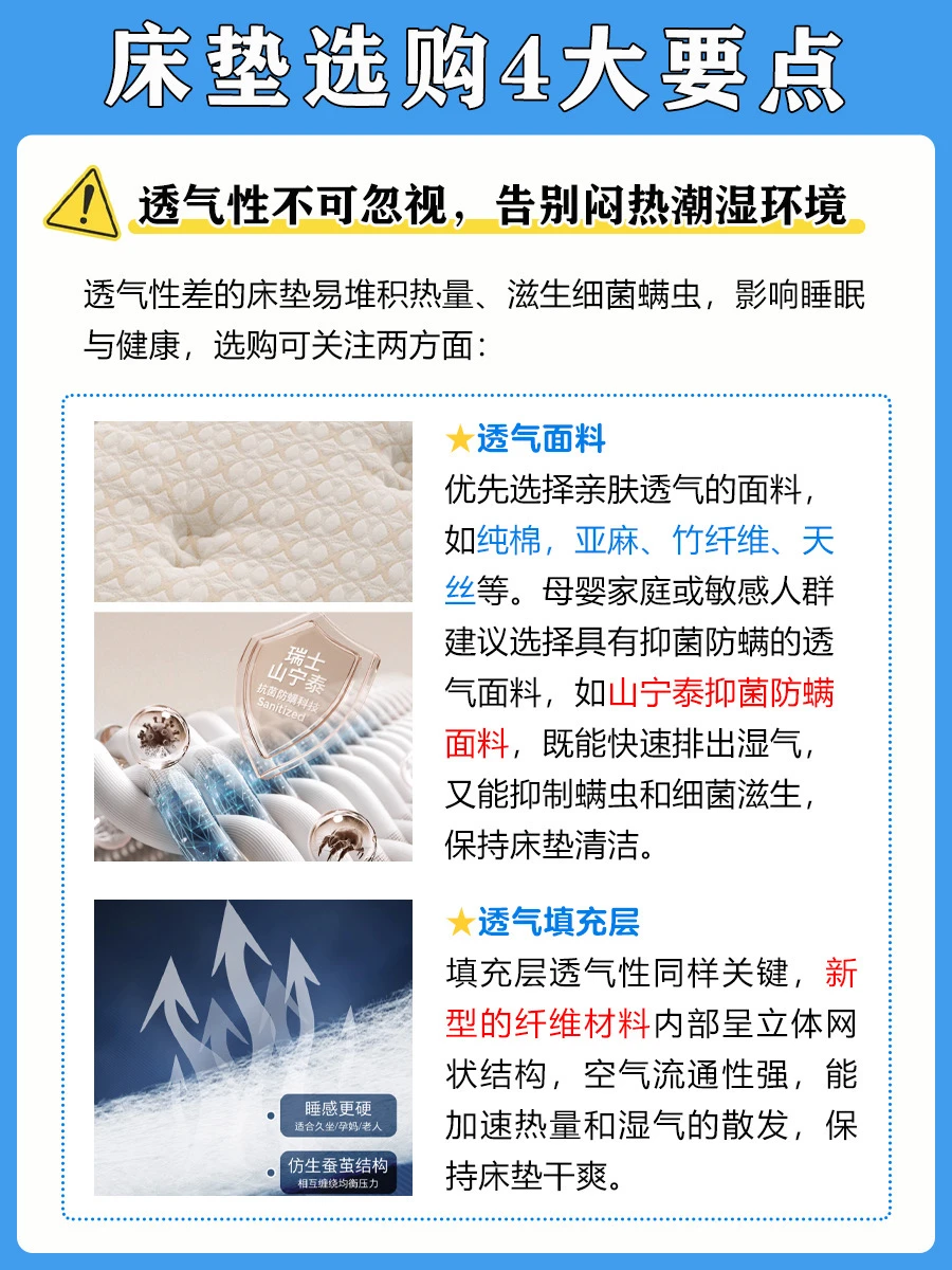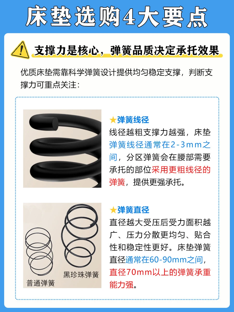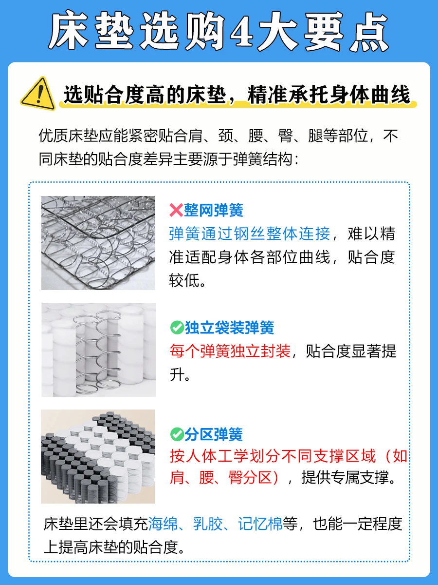 睡眠💤好不好,跟床垫真的太有关系了!选对了床垫,不光能让身体疲劳感减轻不少,还能好好保护咱们的脊椎。下面整理了一些📝选购建议,帮你挑到适合的床垫~ 1️⃣选贴合度高的床垫,精准承托身体曲线 2️⃣支撑力是核心,弹簧品质决定承托效果 3️⃣透气性不可忽视,告别闷热潮湿环境 4️⃣根据人群需求,选择合适的睡感 👉🏻给大家盘点了市面上热门的5款床垫 ✨详细攻略请看图片