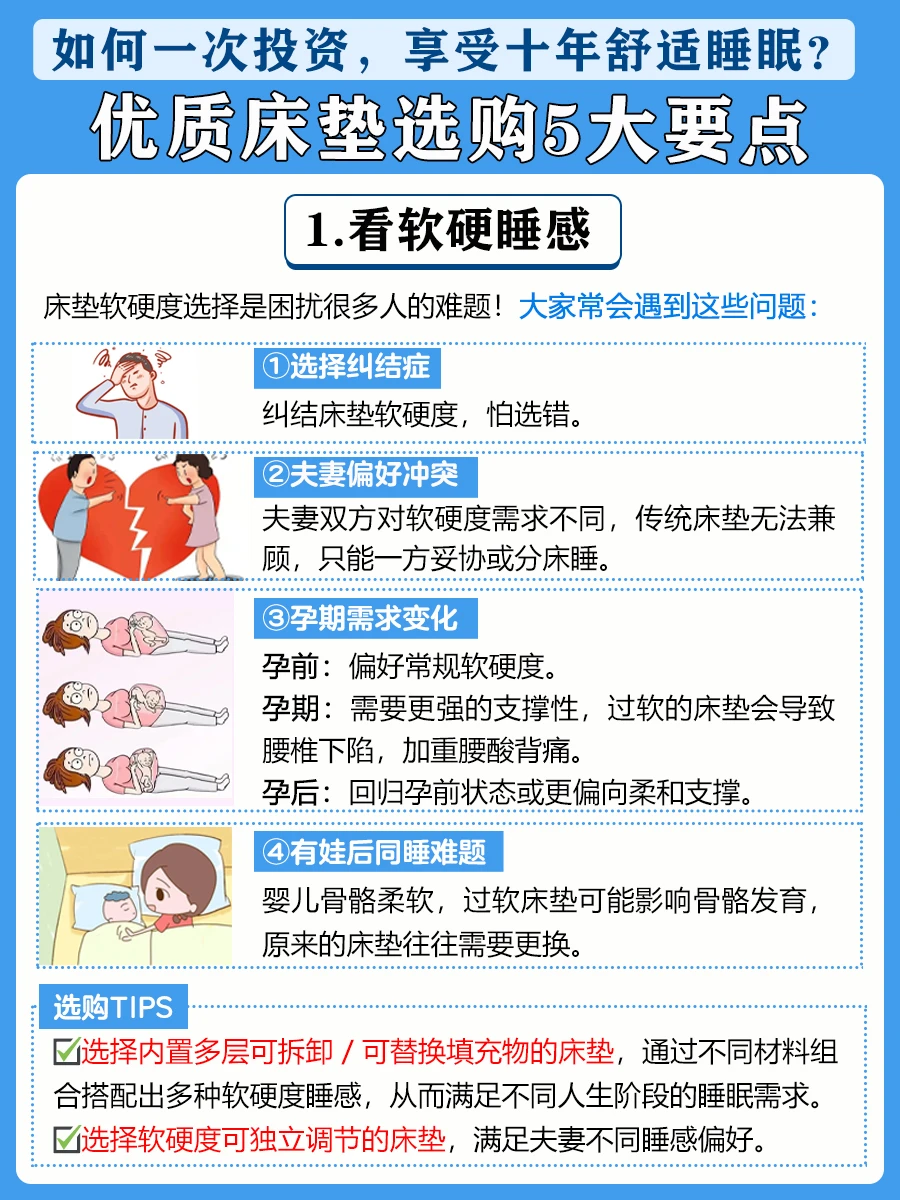 👩人生会变化,今年你喜欢软床,明年可能需要硬一点;结婚、怀孕、变胖变瘦,都会改变你的睡眠需求。推荐选择能随你的身体状况变化而自由调整睡感的床垫,一张床垫轻松搞定十年睡眠。