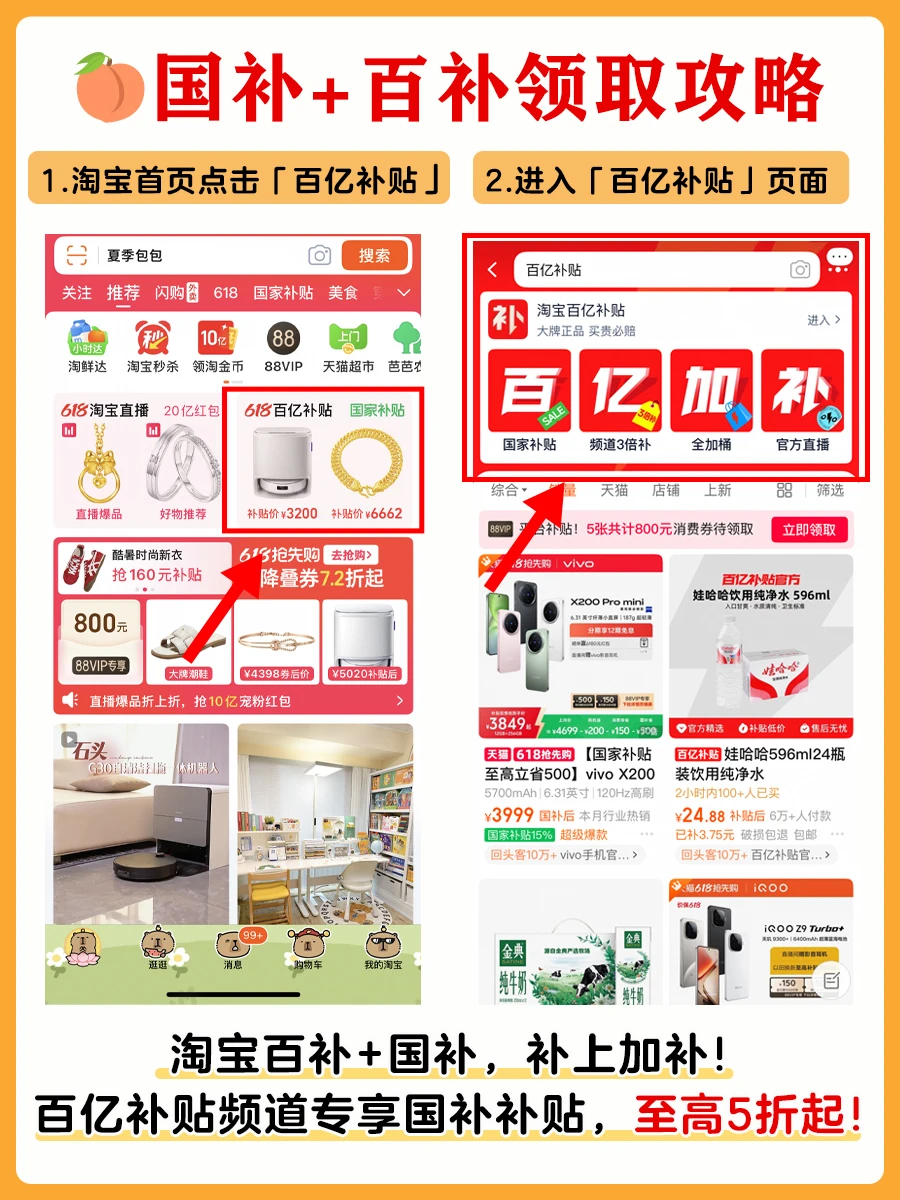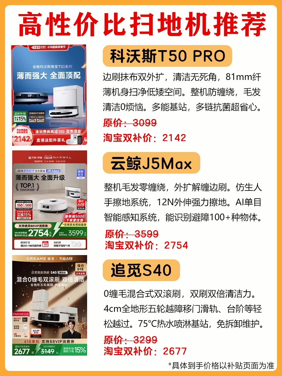 🤔趁着618想要入手一台能好用又性价比高的扫地机,对比了3款热门的扫地机:科沃斯T50 PRO、云鲸J5Max、追觅S40,😉给正在纠结的姐妹们攻略参考,还整理了选购口诀,闭眼抄作业📝不踩雷! 👉🏻正好这3款扫地机都有淘宝百补+国补,双重补贴后价格真的太香了~ ✨科沃斯T50 PRO原价3099左右,淘宝双补价只要2142,直降957元! ✨云鲸J5Max原价3599左右,淘宝双补价只要2754,直降845元! ✨追觅S40原价3299左右,淘宝双补价只要2677,直降622元! 🎉各种家电大牌都比平日价格便宜了不少!快去淘宝点击【百亿补贴】吧!这波福利不要错过啦~ 🩷淘宝现在还有国补叠加百亿补贴,大牌数码家电至高补贴20%,方法步骤都在图里,手把手教你解锁平台福利~羊毛党必看! 🔸如何操作? 1.淘宝输入「百亿补贴」 2.进入「百亿补贴」页面 3.点击「国补」 4.进入「国补」页面 🔸国补折扣: 一级能效/水效补贴20%,二级能效/水效补贴15% 🔸百亿补贴: 专享国补补贴,至高5折起,大牌数码家电至高补贴20% 🌈快去淘宝搜【百亿补贴】立抢「国补+百补」双重礼遇吧!
