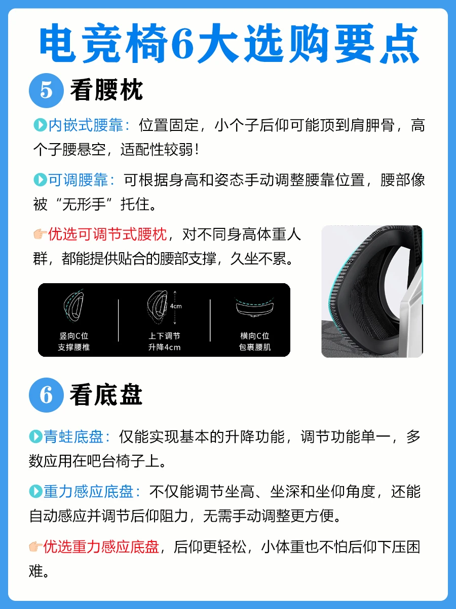 相较于青蛙底盘仅能实现基本的升降功能,更推荐选择重力感应底盘,不仅能调节坐高、坐深和坐仰角度,还能自动感应并调节后仰阻力,小体重不怕下压困难。