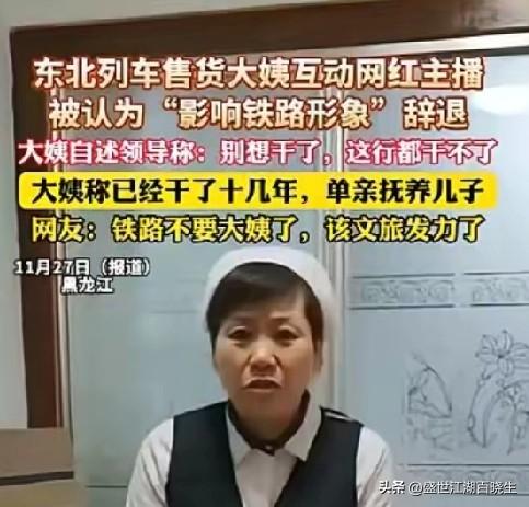 这位列车售货大姨给各位步入岗位的新手们提了个醒,只要你的工作跟系统占一点边儿,一定要记住啊各位千万不要抖机灵,更不要想着出头去做什么亮眼的事情,你等来的不一定是荣誉很可能是灾祸,你上面的人他不需要你有多强的能力与多耀眼的业绩你安安稳稳的就可以了别给他惹事儿,明白嘛?古人言木秀于林风必摧之这是有原因的,如今大姨被辞退了,最好的方式就是与她互动的网红能借着这流量给大姨一碗饭吃,这是最好的结局。