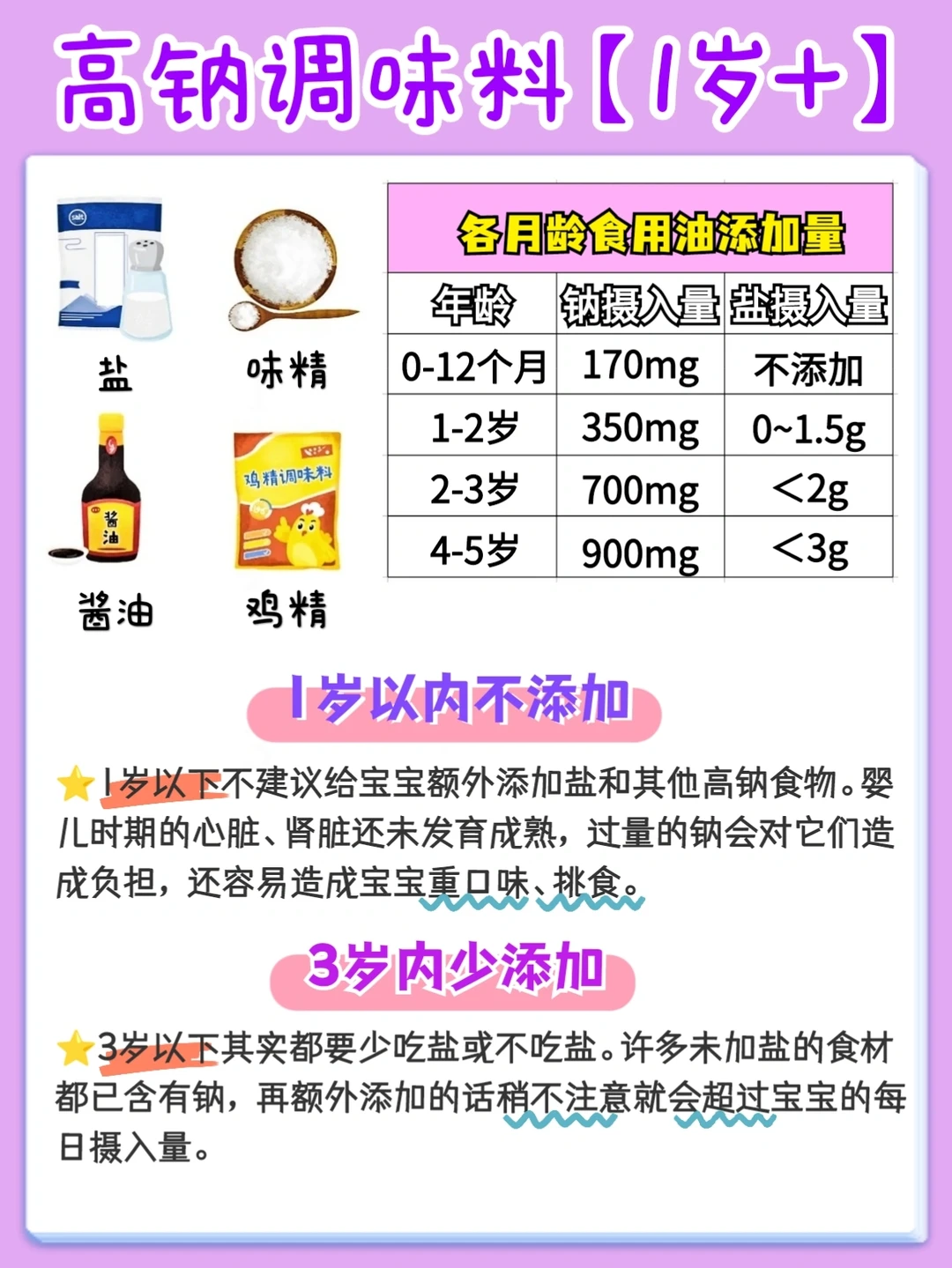 🔸宝宝1岁之前不要额外添加,此时宝宝肾脏还未发育完全,盐等高钠调味料会增加宝宝的肾脏负担,还容易造成宝宝重口味,挑食。