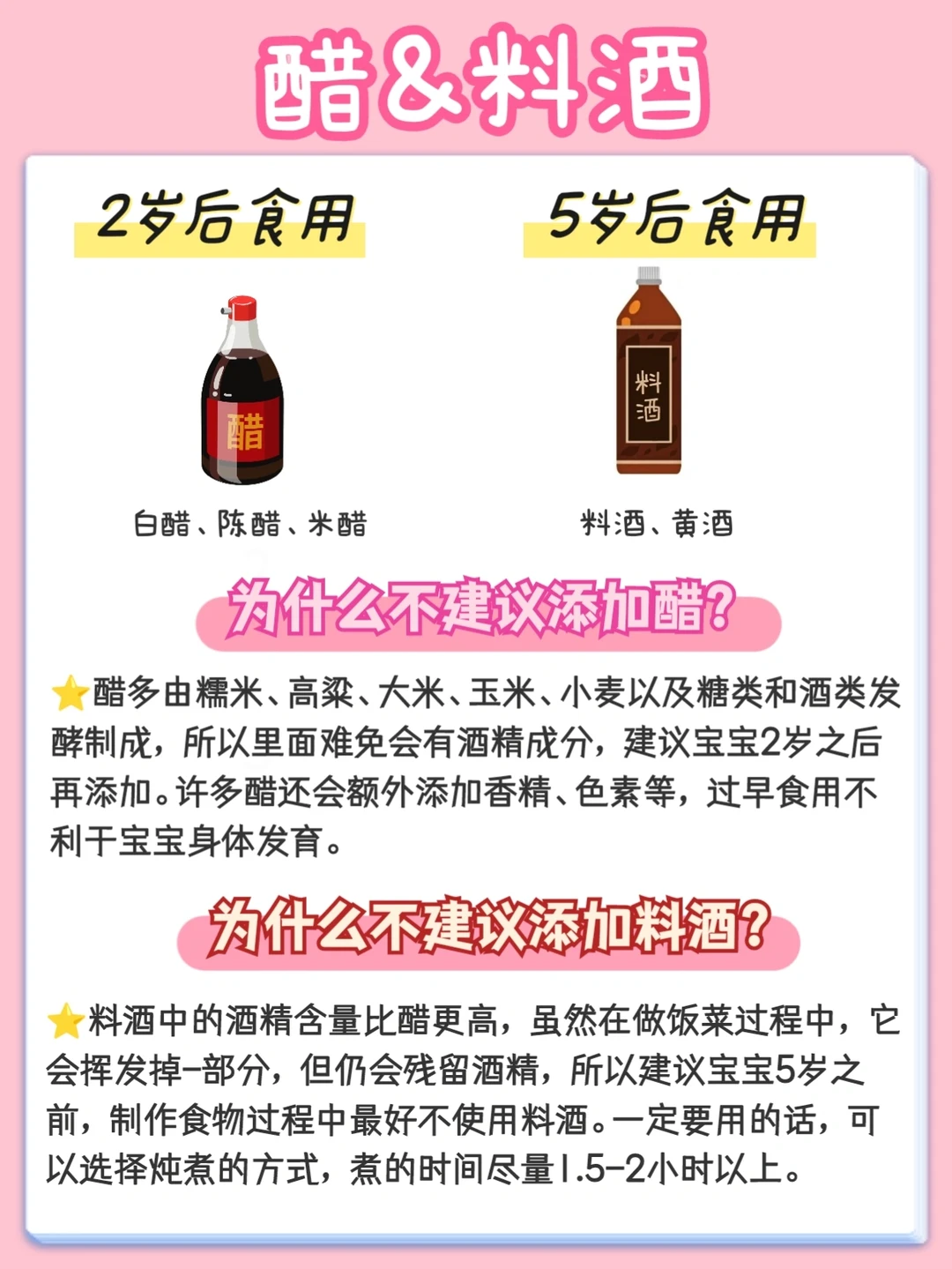醋里含有酒精成分,部分醋还会添加盐、色素、香精等,过早吃不利于宝宝发育。