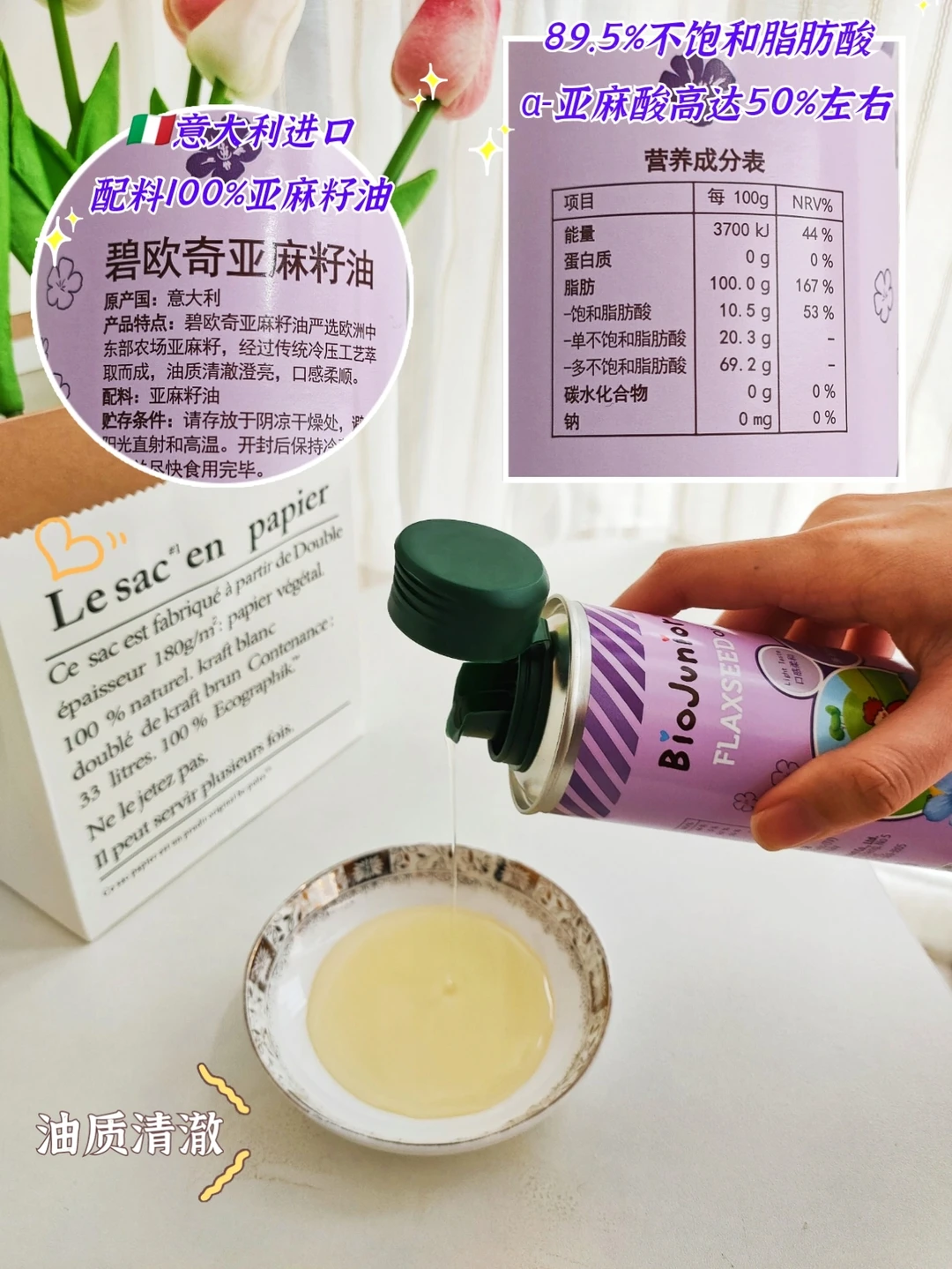 💟我给我们家宝宝刚开始吃的是碧欧奇的核桃油,吃了一段时间又入了碧欧奇的亚麻籽油,这款油的烟点高达231℃,高温炖炒也不会破坏营养成分。规格有250毫升和150毫升的,方便根据自家宝宝用油情况买适量规格,不会浪费。这个油我觉得超方便的就是可用于多种烹饪方式,冷调热炒都ok!