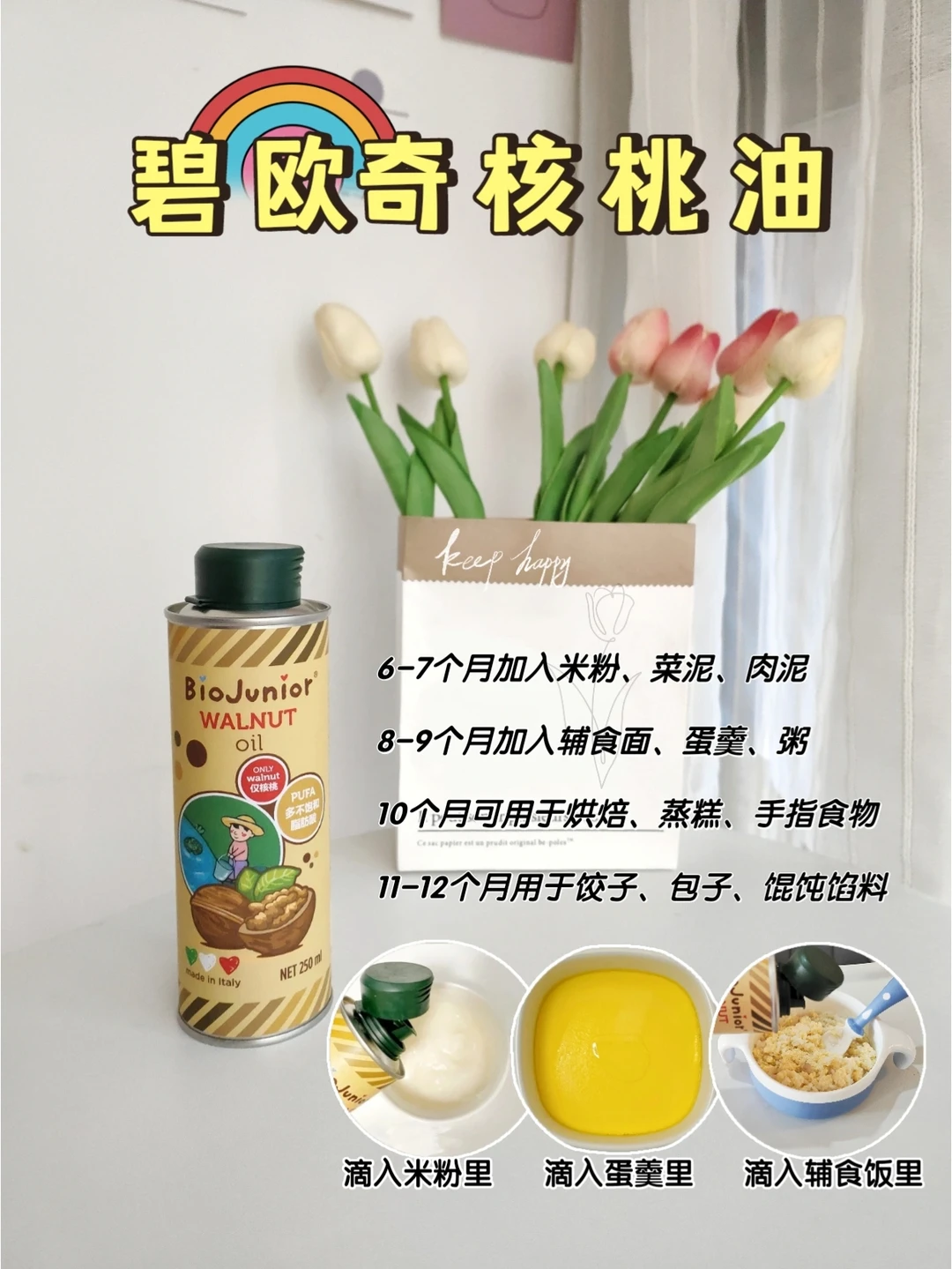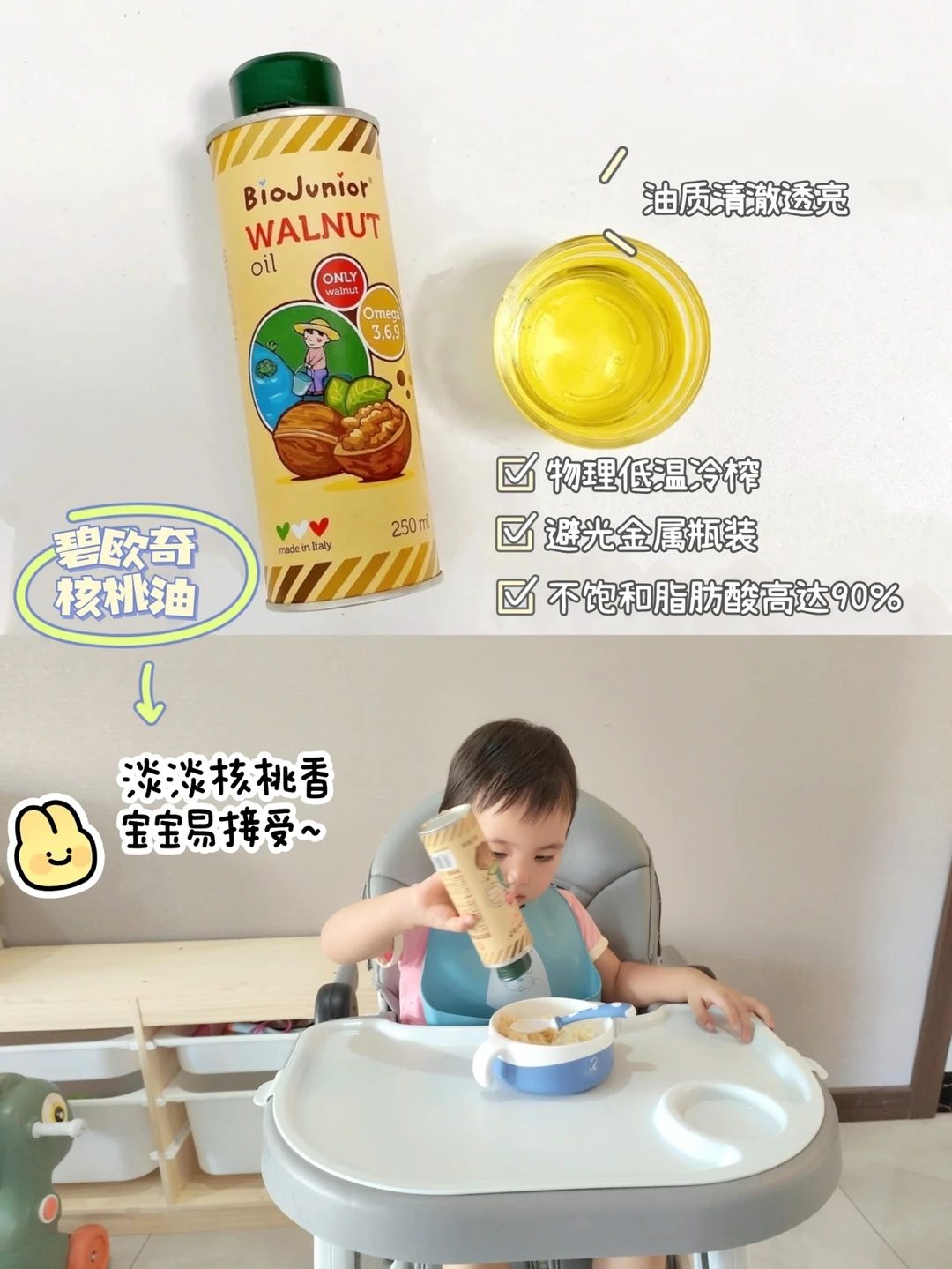 ◾核桃油口感清淡、亚油酸亚麻酸比例均衡,适合宝宝初添加