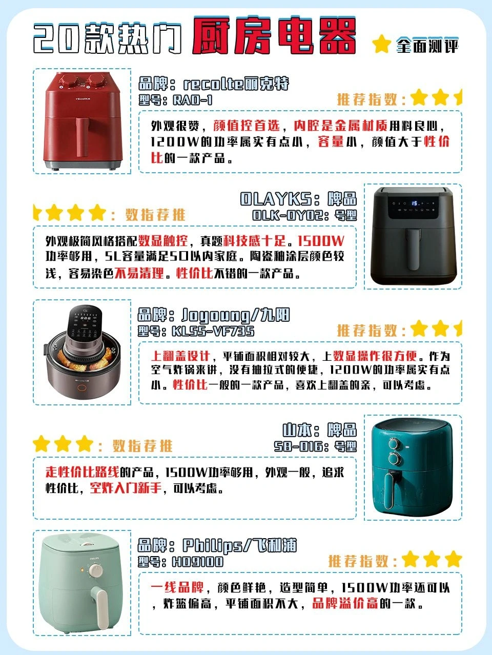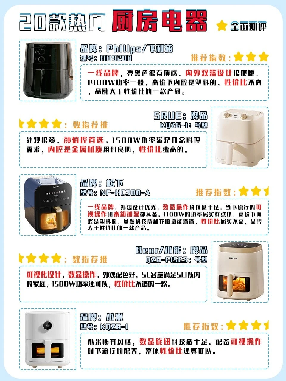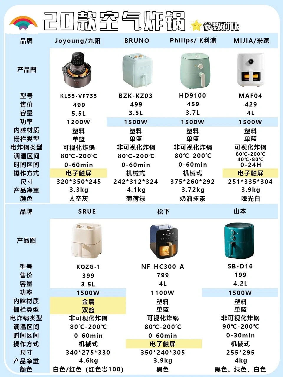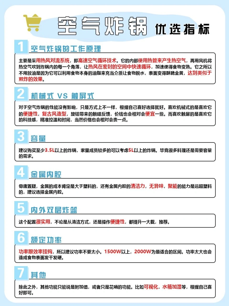 🛑 第二、机械式和触屏式的选择上,这两种对于空气炸锅的性能没有影响,只是方式上不一样,根据自己喜好选择就好。喜欢机械式的是喜欢它的便捷性,复古风造型,旋钮带来的触碰反馈,价钱也会相对会便宜一些。而喜欢触屏的是喜欢它的科技感,准确控温和时间,当然价格也会相对会贵一点。