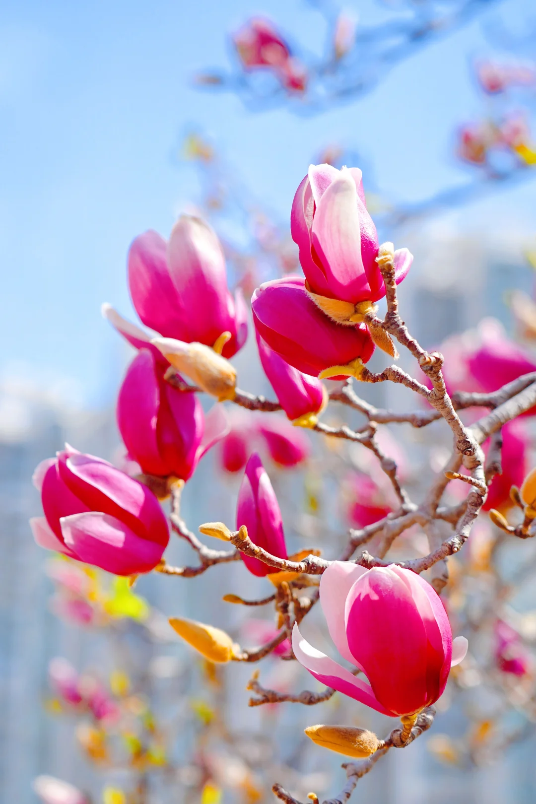 草地上的两排紫玉兰花已陆续盛开,花枝不算高,适合拍花朵儿细节