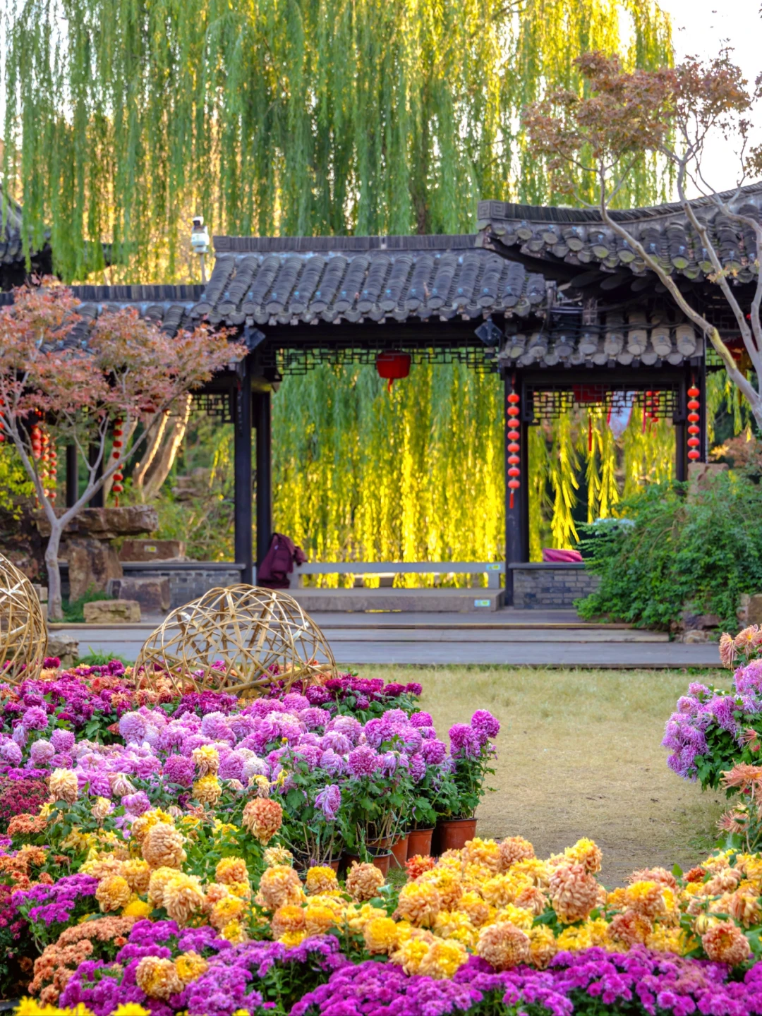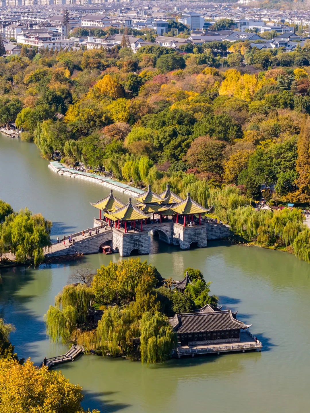 秋日的瘦西湖少了春日人潮,多了静谧诗意~秋柳垂岸映着湖水,菊花展各色菊花争奇斗艳