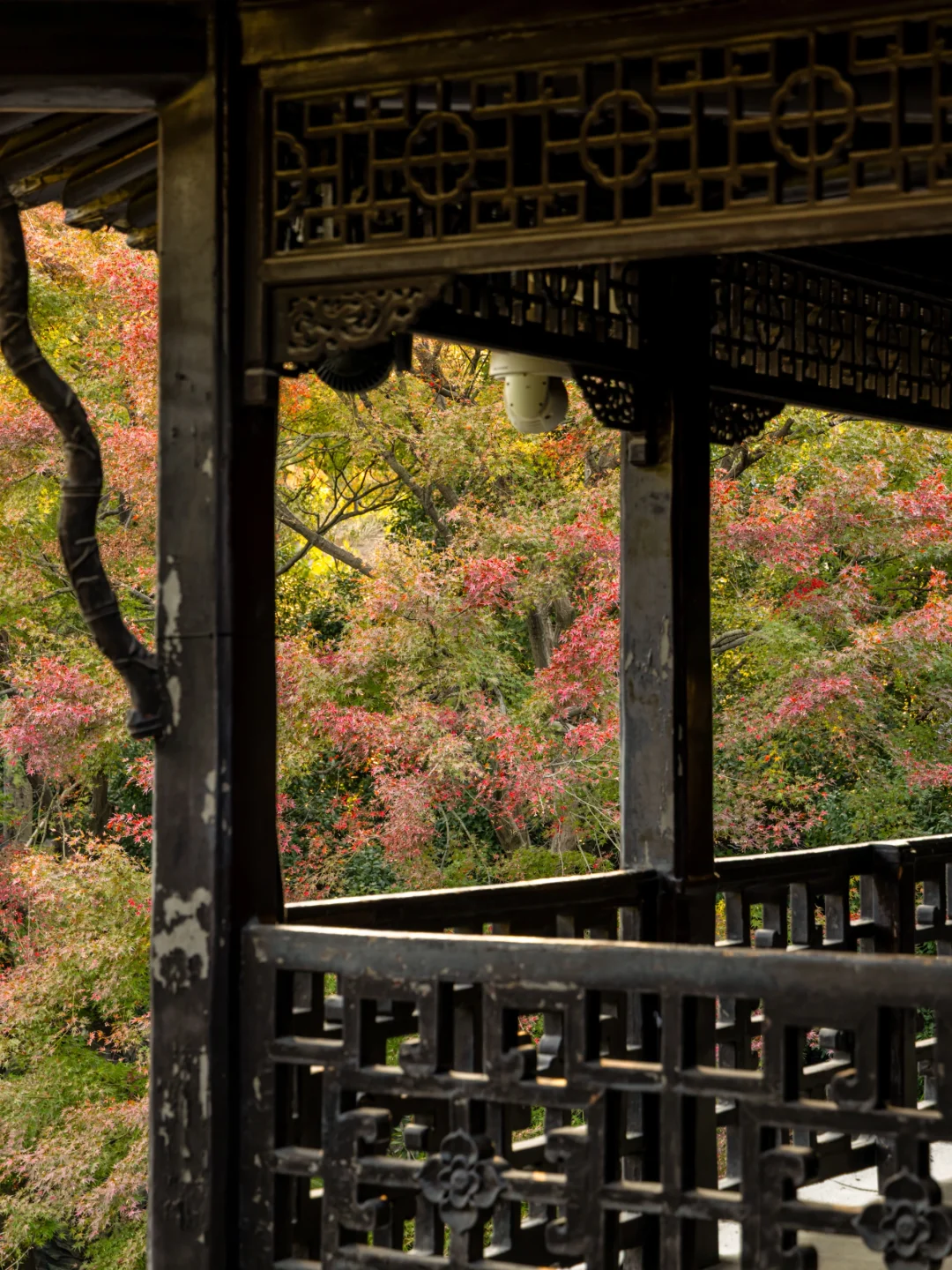 “晚清第一园”的红枫马上红了!鸡爪槭红得热烈,叶片落在雕花窗棂上,古建与红枫相映成趣