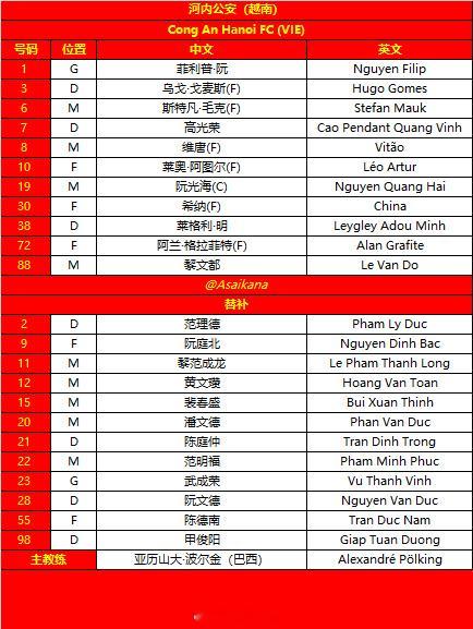 虎扑11月27日讯北京时间2025年11月27日20:15,亚冠2北京国安将在客场对阵河内公安。赛前,双方公布本场比赛首发阵容。
