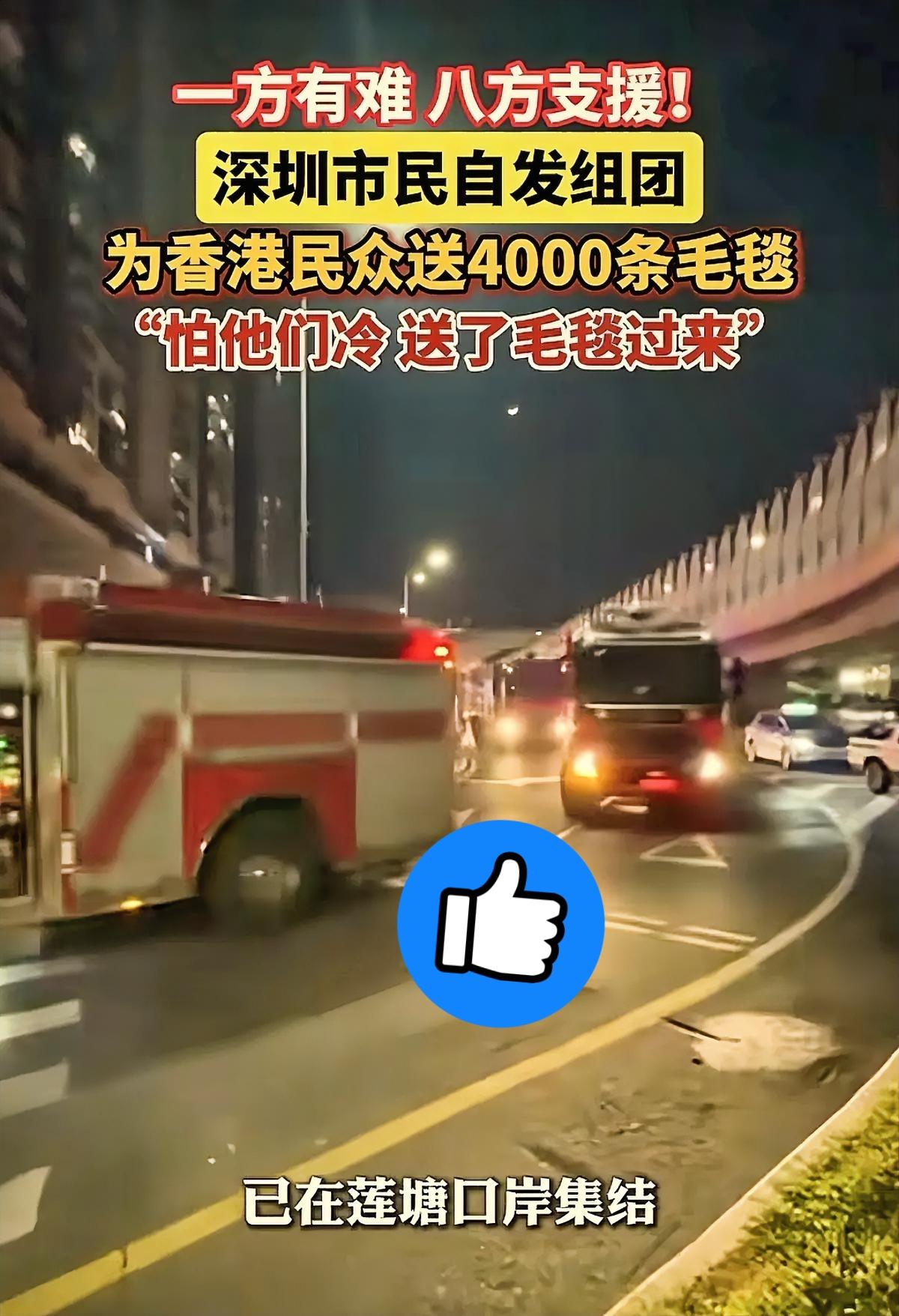 香港受灾后, 深圳人这波操作真让人暖心!! 一群市民自发扛着4000条毛毯往香港送,就因为“怕同胞冷”; 消防车队还深夜在莲塘口岸待命,随时准备驰援! 香港那边也很给力,开放了好几个庇护中心安置超700人,本地市民还扎堆当义工,搬水、送物资、发食物忙不停…… 火灾无情人有情,为深圳点赞!!!!香港山火 香港救人 深圳救火