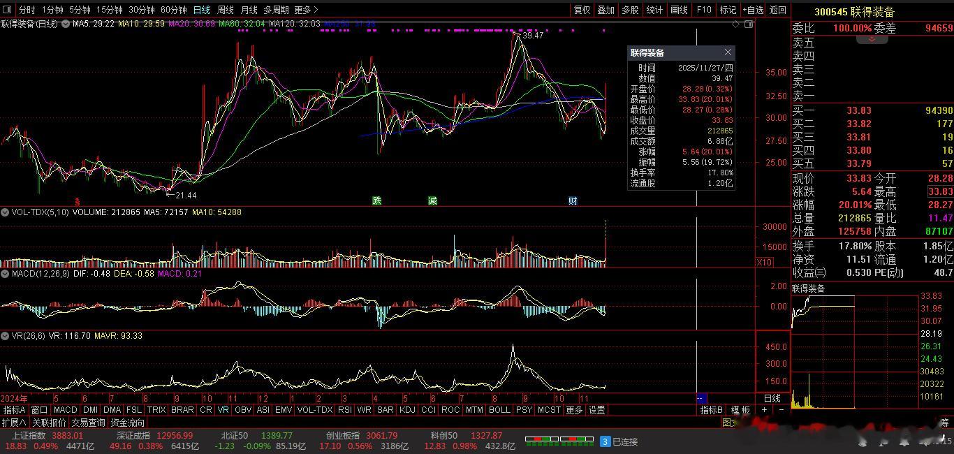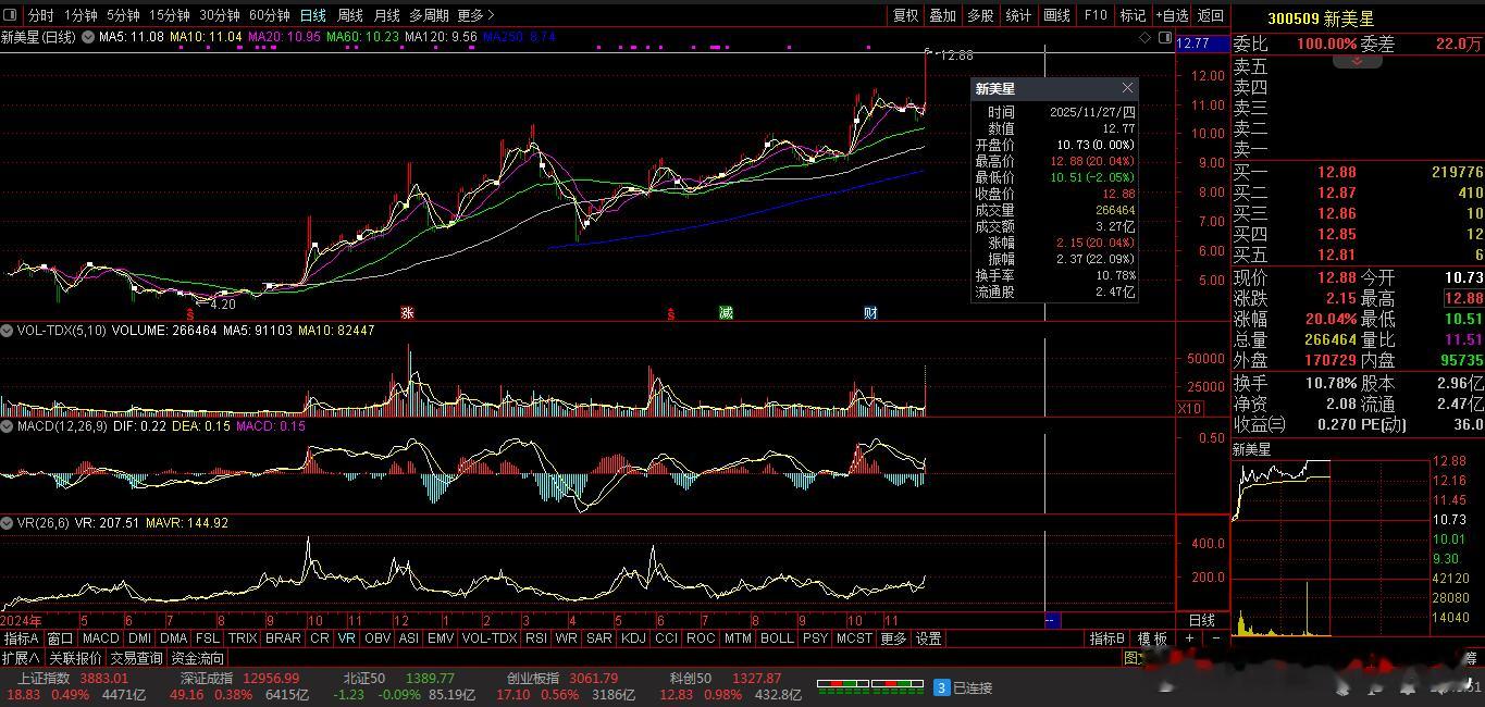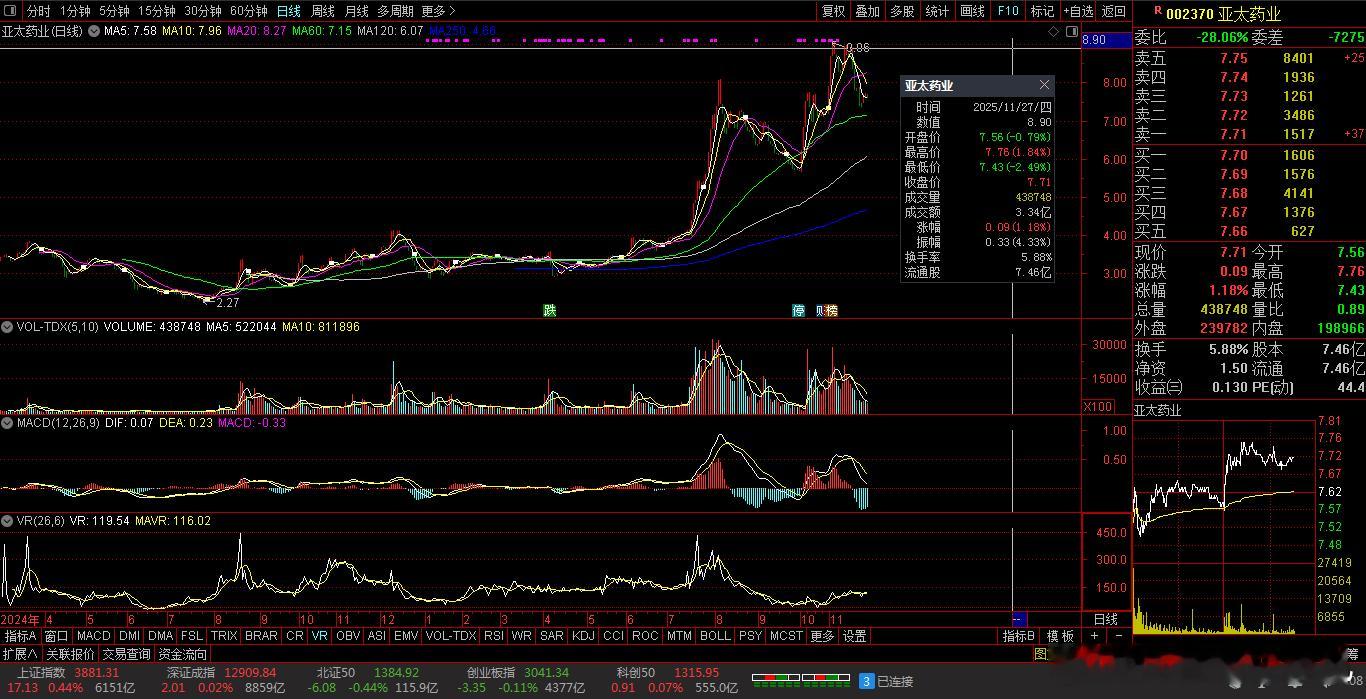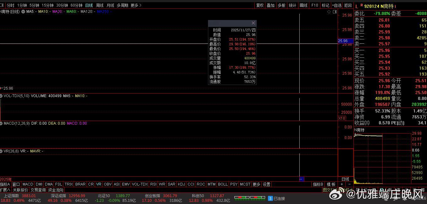【财富晚茶】午盘透析(11.27):北证跌幅0.09%: 体育反弹渔业回调导语:作者系《网易号》优质财经领域创作者。曾经原创作者和知名网易号旅游领域创作者。大跨度行业等的写作,颇受网友喜爱。作品发表于2025.11.27.12:18 优雅端庄晚风。【内容概述】今日股市午评:截止11:30:沪指:贡献2根阳线2阴线。深指:贡献3根阳线1阴线。沪指突破:阻力位:03879点。沪指突破:支撑位:03861点。深指突破:阻力位:13012点。 深指突破:支撑位:12749点。追寻盘面:沪高深低主力拉升,尾盘高位震荡盘跌。一、透析市场:风口公司,上下起伏002370 亚太药业 盘中01涨1、突破六年箱底视野盘面:前期见顶,冲刺前高:2025-11-30 截至11:00:股价报收:7.70元。股指上涨:1.05%。成交总量::438900手,成交金额:3.34亿元。总换手率5.89%,观总市值:57.42亿元。流通市值:57.34亿元。2、医药研产翘楚主营业务:医药研产和销售。公司品牌:集研产销售一体综合型医药头部企业。3、营收减利优秀业绩好转:2025-09-30 三季度报:公司营收:2.2831亿 同比增-25.59%。公司净利:9719.5012万 同比增2909.49%。二、沪深红盘:多方强势,喜剧股市今天目击:沪深北市:早盘:沪指:高开二涨,三跌一涨。深指:低开二涨,四跌一涨。尾盘:三跌一涨,次高红盘。看点之一:沪强深弱:强势盘升:高位震荡。看点之二:一黑天鹅:北指弱势:冲高回落。看点之三:沪深北市:半日成交:10885亿元,较前一日:缩量465.72亿元。盘面追踪:3338股飘红。三、沪深阳棒:个股强势,赚钱效应沪深追踪:截至午间:市场收盘:沪指涨0.49%报3883.01点,深指涨0.38%,创指涨0.56%,北证50指跌0.09%,沪深北市:10885亿元,较前一日:缩量465.72亿元。四、盘面观察:体育脉冲,渔业回落1、板块扫描透析沪深板块:板块走强:体育、造纸、林业、化工等。板块回调:影视、渔业、电子、医疗等。概念活跃:有机硅、玻璃基板、钠电池等。2、个股涨跌起伏沪深北市:多空遭遇。3338股票上涨,55涨停板。1884股票下跌,7股跌停板。沪深北市:合计成交:10885亿元。午盘视野:沪高深低强势次高,尾盘高位筹码兑现。五、沪深涨跌:三甲前茅,安不忘危1、今日涨幅谁家主旋律:天经地义:风口股票涨停板920124 N南特 300509 新美星 300545 联得装备第一、涨幅榜眼排行榜-1:920124 N南特主营业务:精密机械零部件研产和销售。公司品牌:精密机械零部件制造领域龙头企业。排行榜-2:300509 新美星主营业务:液体包装机械研产和销售。公司品牌:全球领先的液体包装解决方案供应商。排行榜-3:300545 联得装备主营业务:新型半导体显示智能装备-汽车智能座舱系统装备-半导体封测设备-锂电装备的研产和销售。公司品牌:国内领先的LCD/OLED整线模组-柔性制造-非标自动化设备提供商。技术看盘-1:920124 N南特。潜力股票-1:920124 N南特:精密机械零部件制造领域龙头企业。风险股票-1:暂时没有:即无301092 争光股份。2、今日跌幅谁家主旋律:摇摇欲坠:弱势股票涨停板301001 凯淳股份 301136 招标股份 000859 国风新材跌幅榜-1:301001 凯淳股份主营业务:国内外知名品牌提供综合性的电子商务服务-客户关系管理服务。公司品牌:全渠道服务品牌方品牌营销到产品销售到客户关系管理综合头部服务商。跌幅榜-2:301136 招标股份主营业务:工程监理试验检测-招标服务测绘与地理信息勘察设计-其他工程咨询的研产和销售。公司品牌:中国全过程工程咨询行业综合实力百强。跌幅榜-3:000859 国风新材主营业务:高分子功能膜-光电新-绿色环保木塑新-新能源汽车轻量化材料的研产和销售。公司品牌:国内烟草厂商BOPP薄膜头部供应商。六、创作不易:优质网易,财经作者投资投机迷茫之中:给予尽可能有帮助:资本市场风险自负。(优雅端庄晚风《网易号》财经领域创作者和原创作者 违者必究)