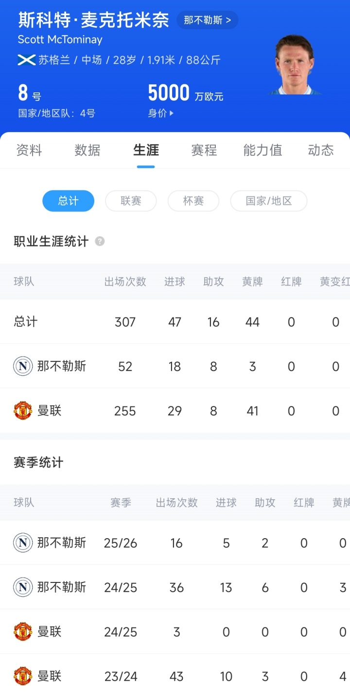 去年夏窗麦克托米奈以3050万欧元的转会费,离开效力了22年的曼联加盟那不勒斯,首个赛季便随球队夺得意甲冠军,并当选意甲赛季最佳球员。目前28岁的麦克托米奈德转身价为5000万欧元,他与那不勒斯的合同将在2028年6月到期。