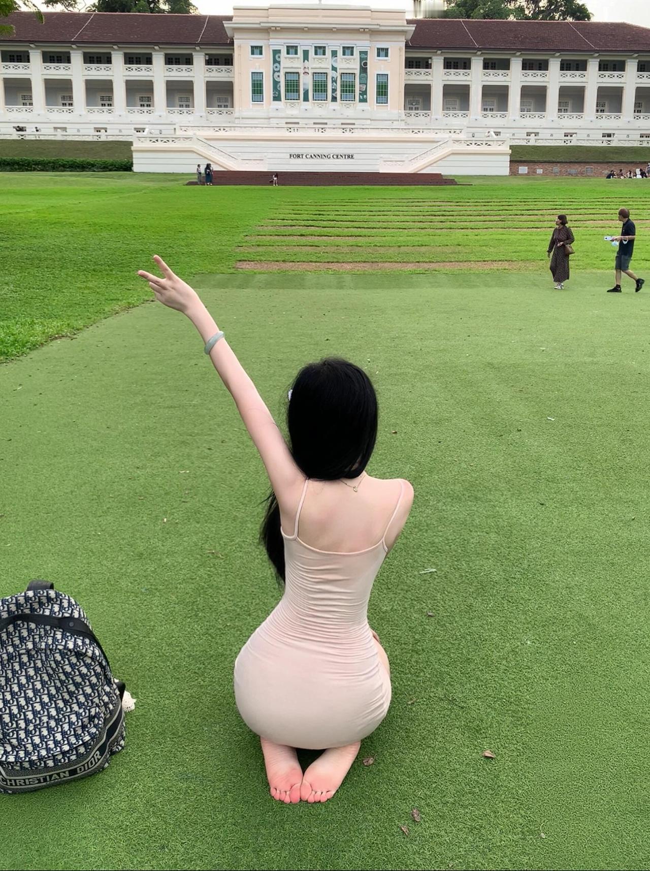 🌿在新加坡福康宁中心的大草坪,邂逅一组治愈系氛围大片✨ 裸粉吊带裙勾勒出温柔曲