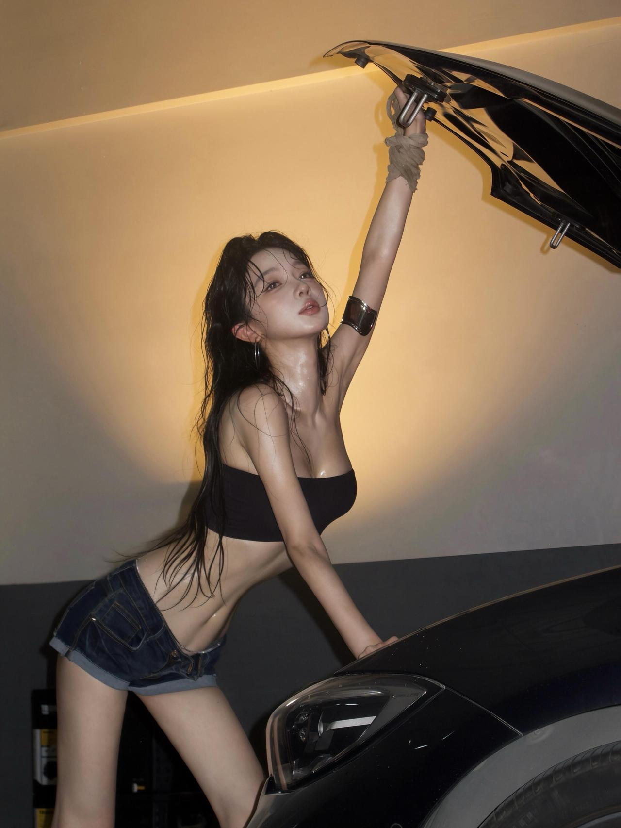 车库里的“扳手辣妹”,把汗水活成最野的高光 谁说修车间只属于满手油污的糙汉?当她踩上引擎盖,湿发黏在泛红的颈间,黑抹胸裹着腰线,扳手在指尖转成利落的弧不是来当背景板,是真能摸清机械脉络的“酷姐”。 汗水顺着马甲线淌成光,金属冷意撞碎柔媚标签,连风掠过车库时,都带着“别用刻板印象定义我”的嚣张。酷感机车女郎 修理工美女 豪车辣妹 酷感女郎 打工的girl 美女机修 修理工妹子