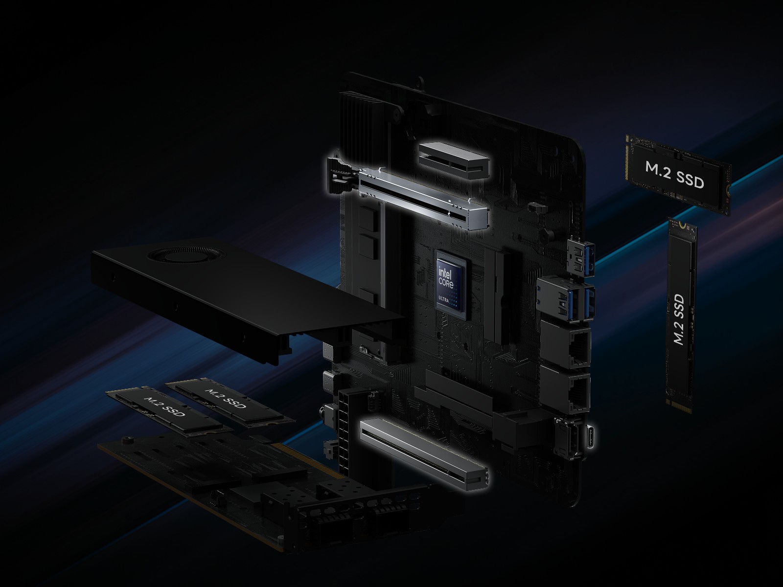 MS-02Ultra体积约为4.8L,采用抽拉式设计,搭载英特尔Ultra200HX"ArrowLake-HX"系列处理器,拥有4个DDR5SODIMM内存插槽、2个M.22280PCIe4.0×4盘位。