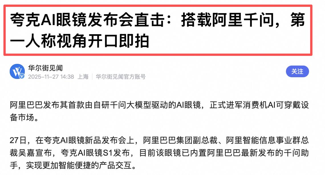 科技圈又有大动作?一个变化可能引领未来十年趋势。 我最近发现AI变了,不再只是局限在手机里,它正在疯狂从屏幕里往外跑,从电脑桌面到汽车,从手机到机器人,小鹏最新的IRON都已经以假乱真,只能说科技迭代的速度现在比我们想象得快太多。 而今天夸克AI眼镜发布这一刻,我突然有种很直观的感觉:AI真的把未来变成了现实。 以前我对所谓的 AI 眼镜毫无感觉,说好听点叫前沿产品,说不好听就是能不能用全凭缘分,但这次阿里是真的它做到了成熟和完善,天花板直接拉升了一大截。 而且夸克这次不是单纯描绘一个概念,而是直接把千问塞进眼镜里,让AI真的变成随身跟着你的助理。 你走在路上,说一句“你好千问”,它就能告诉你怎么走,看到不懂的东西,它立刻帮你解释;你想拍照拍视频,一按就稳,暗光也清清楚楚。 这种感觉完全不一样,AI不再是等着你用,而是随时在你身边,一句话就冲上来帮你搞定。 发布会上的一句话我觉得特别准确:未来AI眼镜会是下一代人机交互的感官中枢。说得更直白一点,手机永远做不到AI眼镜这么主动。 更难得的是,这次夸克把科技产品做成了日用品,佩戴感受大大提升,轻薄、不压耳、不压鼻,戴久了都不累。 这段时间阿里持续在AI领域发力,这个节奏明眼人都能看出来,这是真的想把未来AI机遇握在手里,把一整套生产力塞进一个你每天都戴着的眼镜里。 这条赛道,中国科技企业走定了!而且不是未来,就是现在,我们不怕任何人的挑战。