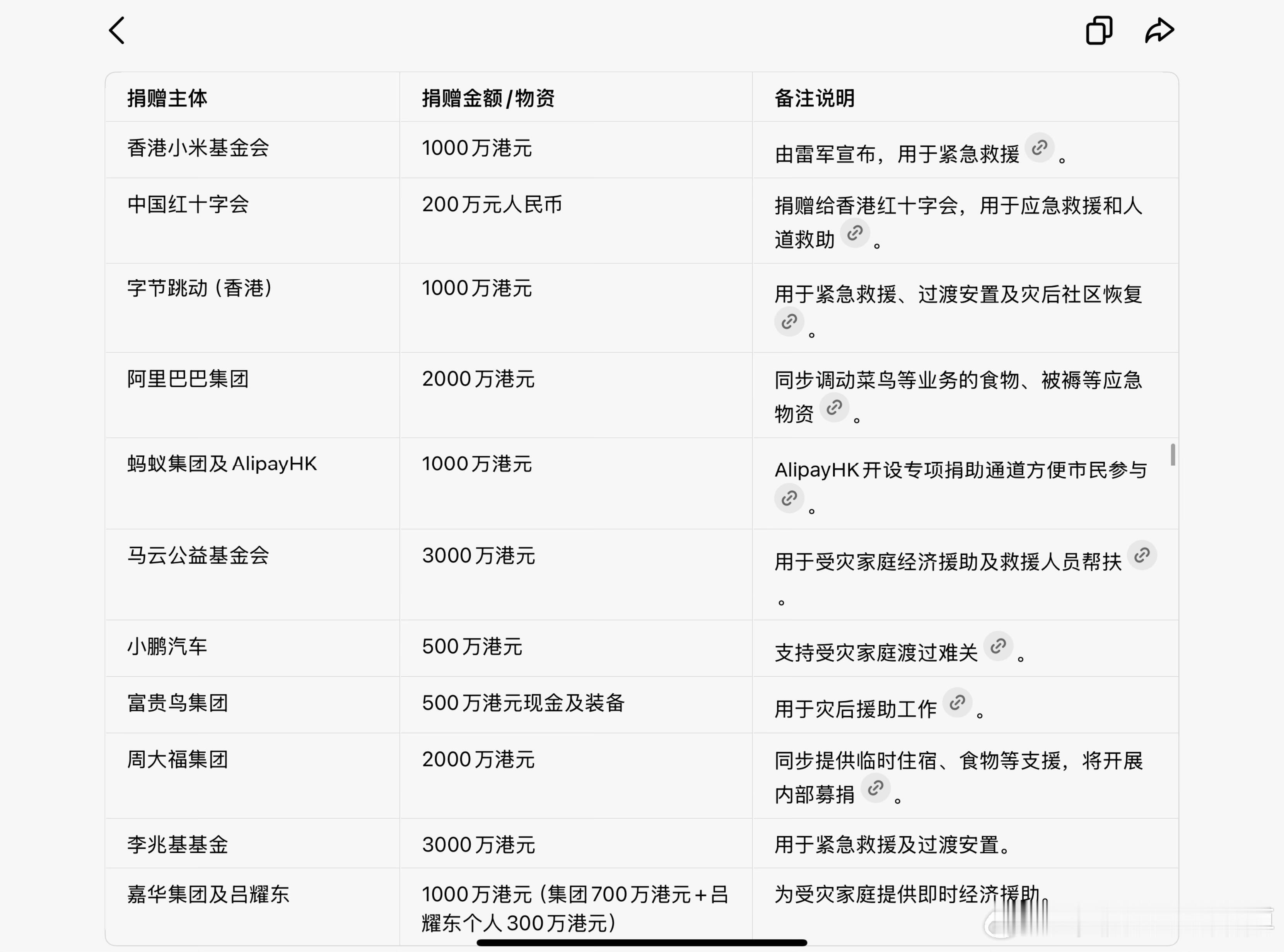 马云一个人给香港捐了3000万!2025年11月26日,香港新界大埔宏福苑发生五级火灾,造成了重大人员伤亡和损失。截至2025年11月27日,已有多家中国企业和企业家宣布为香港大埔火灾捐款(见P2)。据不完全统计,马云公益基金会 3000万 、李嘉诚基金会 3000万(设立紧急援助基金)、安踏集团 3000万(含1000万现金及2000万物资)、阿里巴巴集团 2000万 、周大福集团 2000万、蚂蚁集团及AlipayHK 1000万、比亚迪(香港) 1000万 、李兆基基金 1000万、腾讯公益慈善基金会 1000万、香港小米基金会 1000万、嘉华集团及主席吕耀东 1000万(集团700万+个人300万)、361°集团 1500万(现金及装备)、量化派 100万……马云一个人捐了3000万,真是一点不含糊啊!后续可能还会有更多的企业加入捐赠行列。一起持续关注,希望伤亡不再增加,早日恢复正常~SM向香港捐款100万元香港火灾已有55人遇难香港起火大楼内发现生还者香港起火大楼已无大面积明火 sm向香港捐款100万元