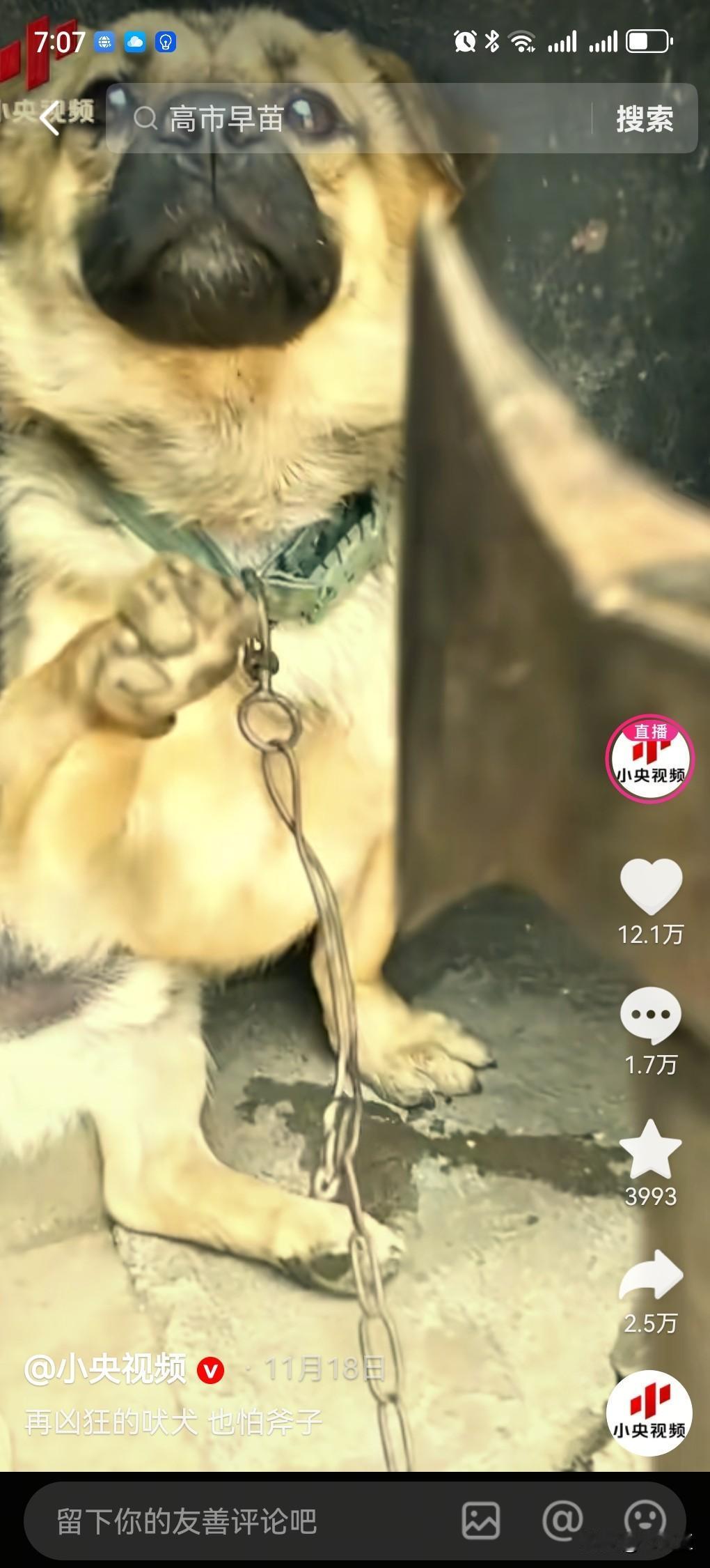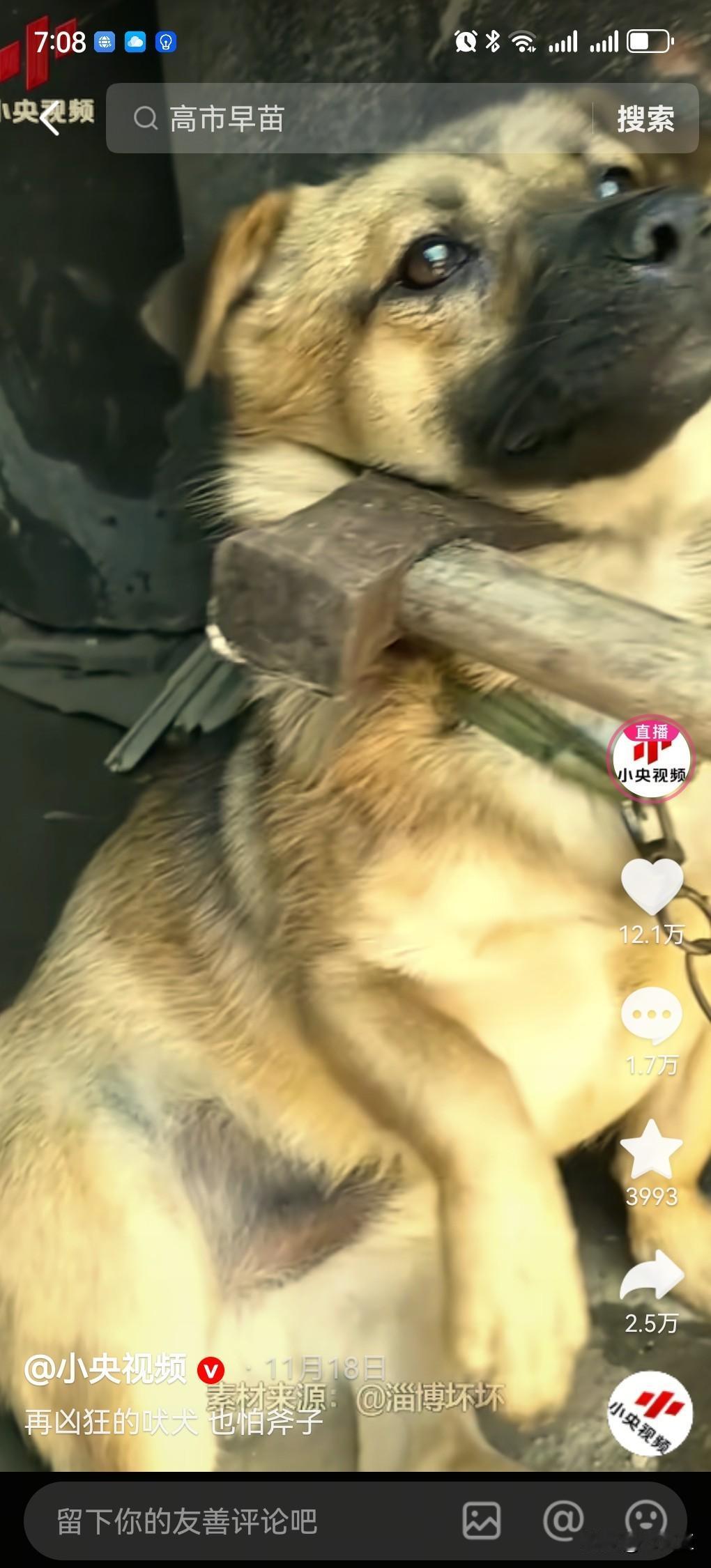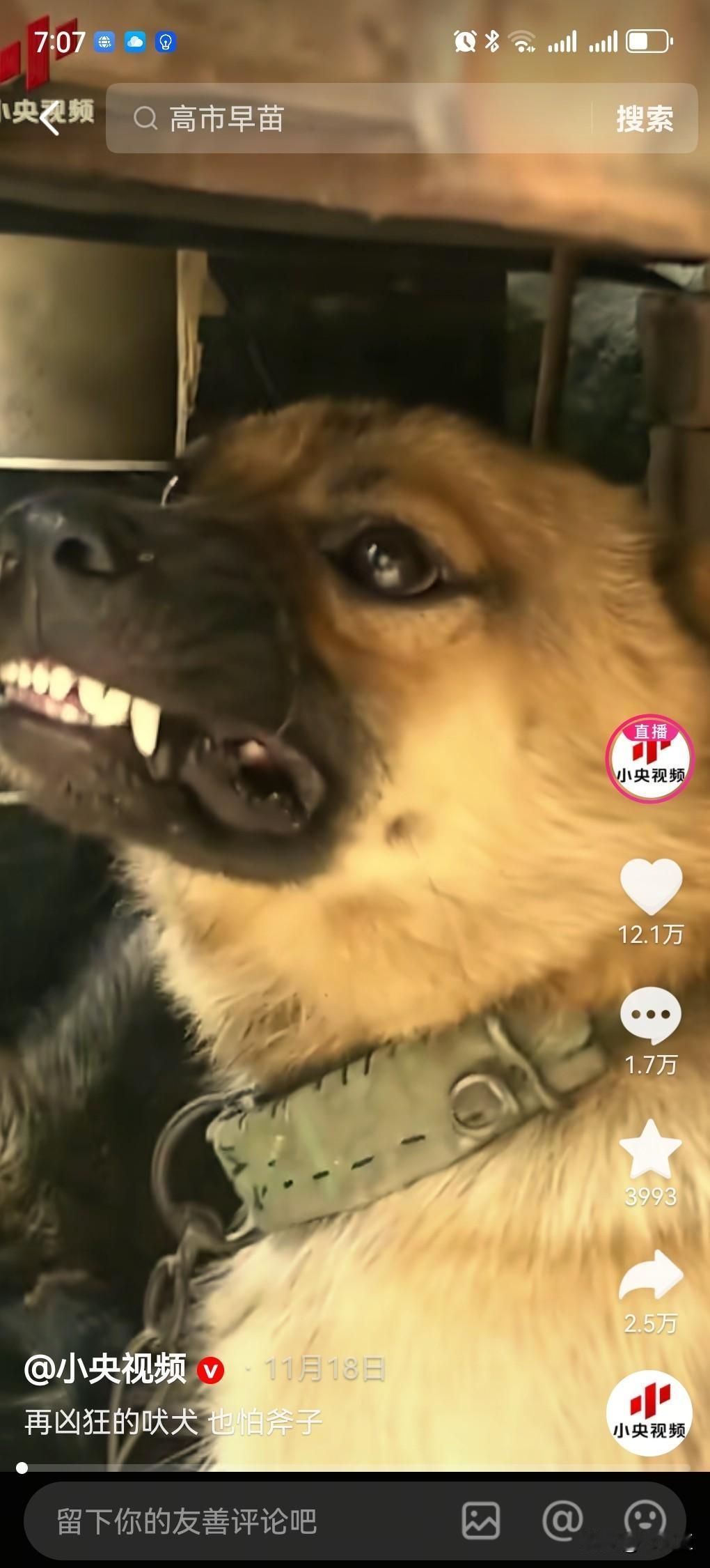 央视居然发了这个视频。一只狗呲牙要咬人,拿起斧头,立马怂了! 没想到一向严肃的官媒会发这种视频,以为是工作人员失误呢?但细想,豁然开朗了:狗再凶,它也是个畜生。跟它讲道理不如讲武力! 不过提个建议:下次能不能把这个狗换成秋田犬?