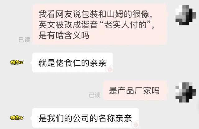 根据网友图片,二者都是黄色的包装,包装上文字的摆放位置极为相似,而在产品商标处,山姆产品中的“Member’sMark”则变成了“Laoshiren’sFood”。发帖网友质疑该包装上的文字“阴阳”购买的人。