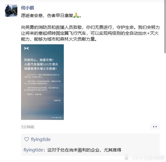香港火灾已致44人遇难 小鹏汽车捐赠500万港元驰援香港大埔火灾救援 !这对于处在尚未盈利的企业,尤其难得。我已经暗示了,建议大师兄自己出 小鹏汽车捐赠500万港元 小鹏汽车捐赠500万港元驰援香港 小鹏汽车