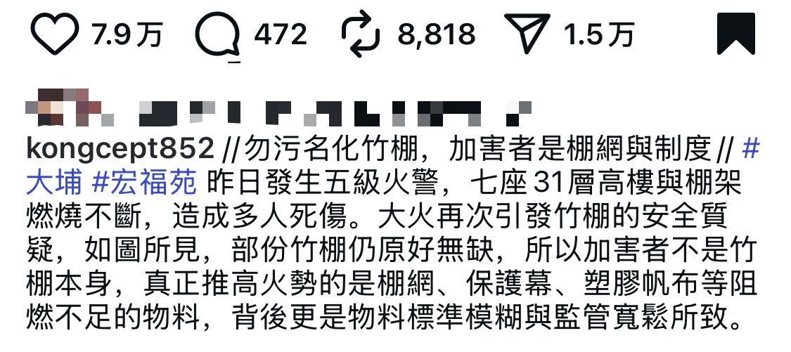 因为火灾,这两天对竹脚手架的讨论很多,一些港人呼吁不要污名化竹脚手架。 香港7栋