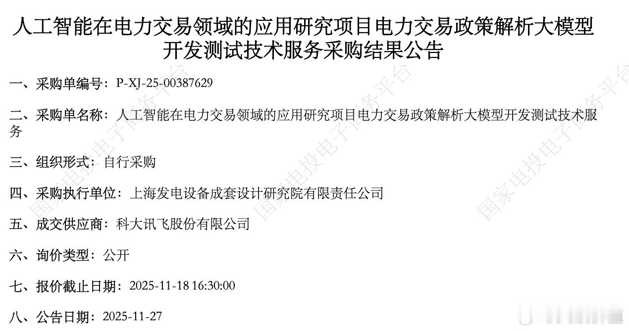 11月27日,信达资产AI大模型知识库项目,科大讯飞中标。11月27日,上海发电设备成套设计研究院发起的人工智能在电力交易领域的应用研究项目电力交易政策解析大模型开发测试技术服务项目开标,科大讯飞中标。