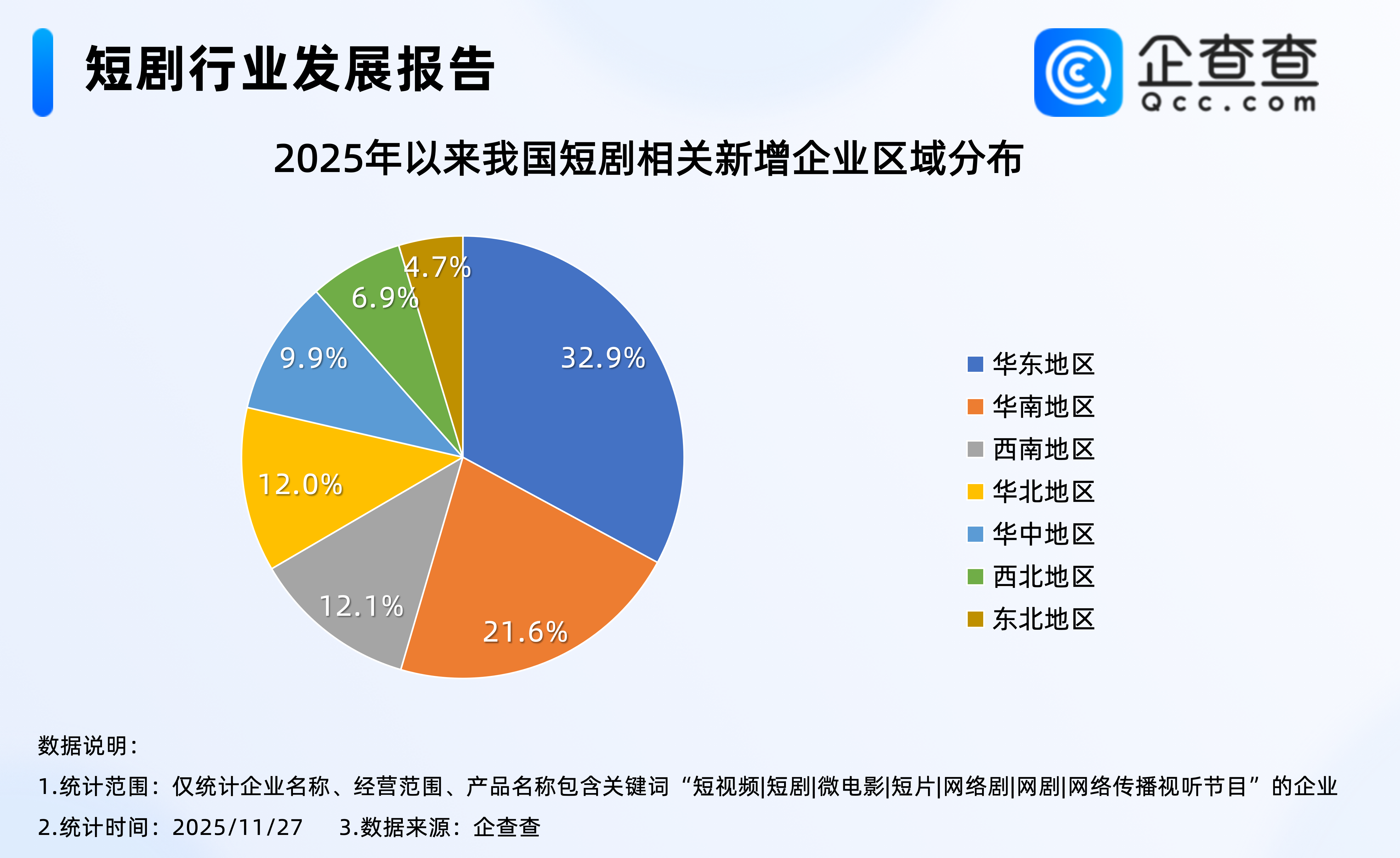 企查查数据显示,2025年以来注册的2.02万家短剧相关企业中,分布在华东地区的相关企业最多,占比32.9%,其次是华南地区,占比21.6%,西北、东北地区相对最少,分别占比6.9%、4.7%。