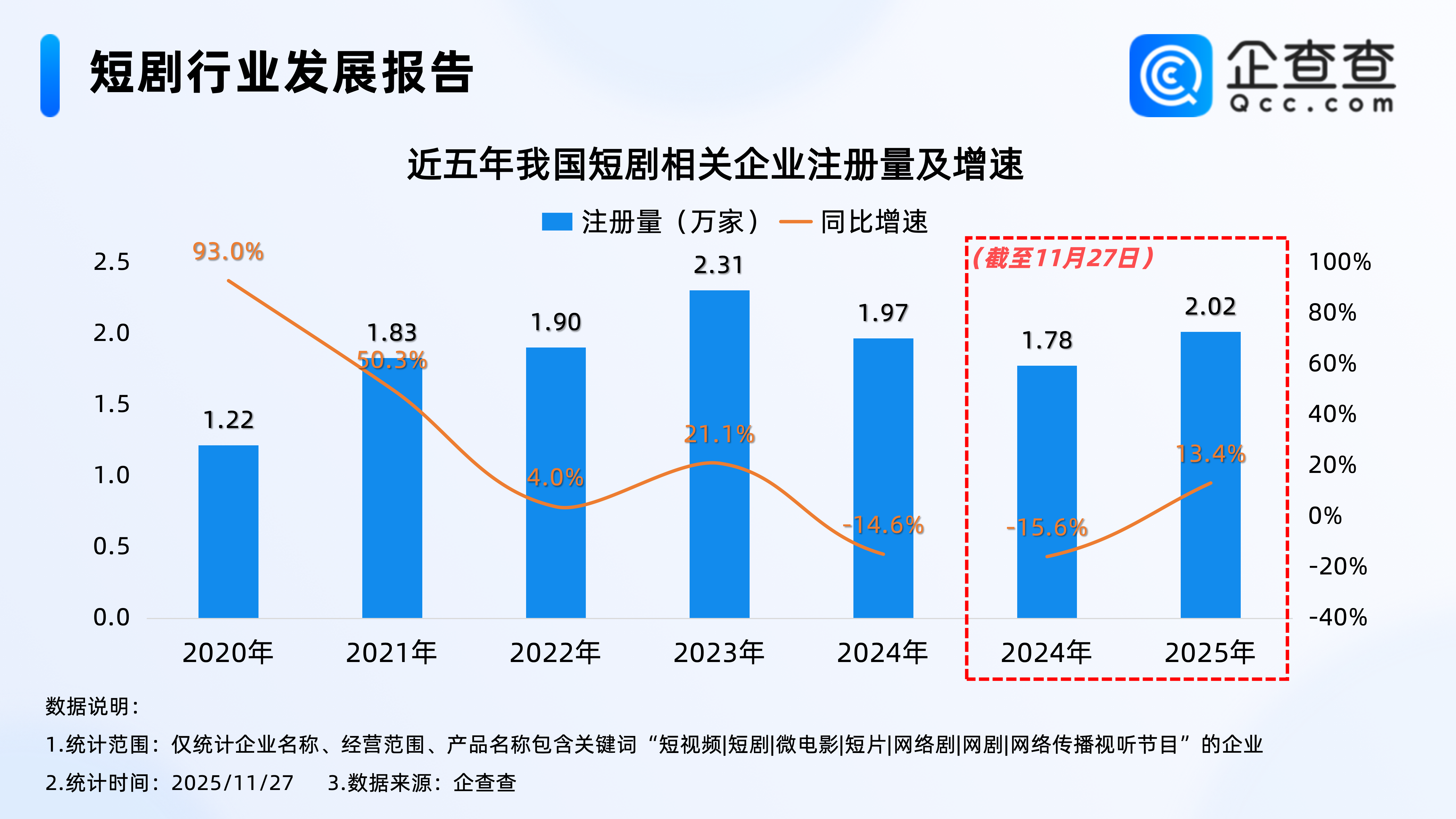 企查查数据显示,2020年以来,我国短剧相关企业每年注册量基本逐年增加,2023年全年,我国注册2.31万家短剧相关企业,达近五年注册量峰值;截至11月27日,2025年我国已注册2.02万家短剧相关企业,已超2024年全年,相比2024年同期增加13.4%。