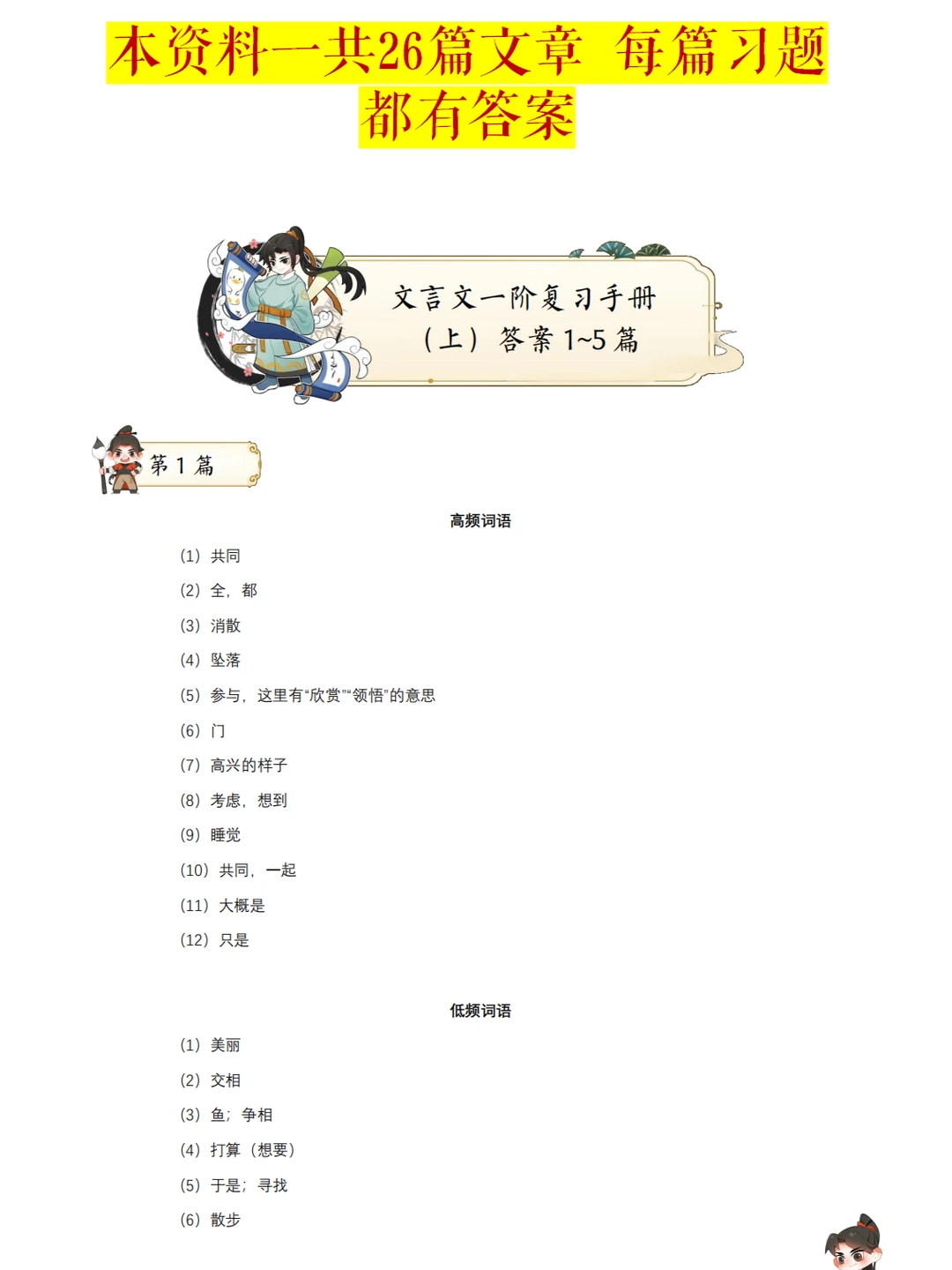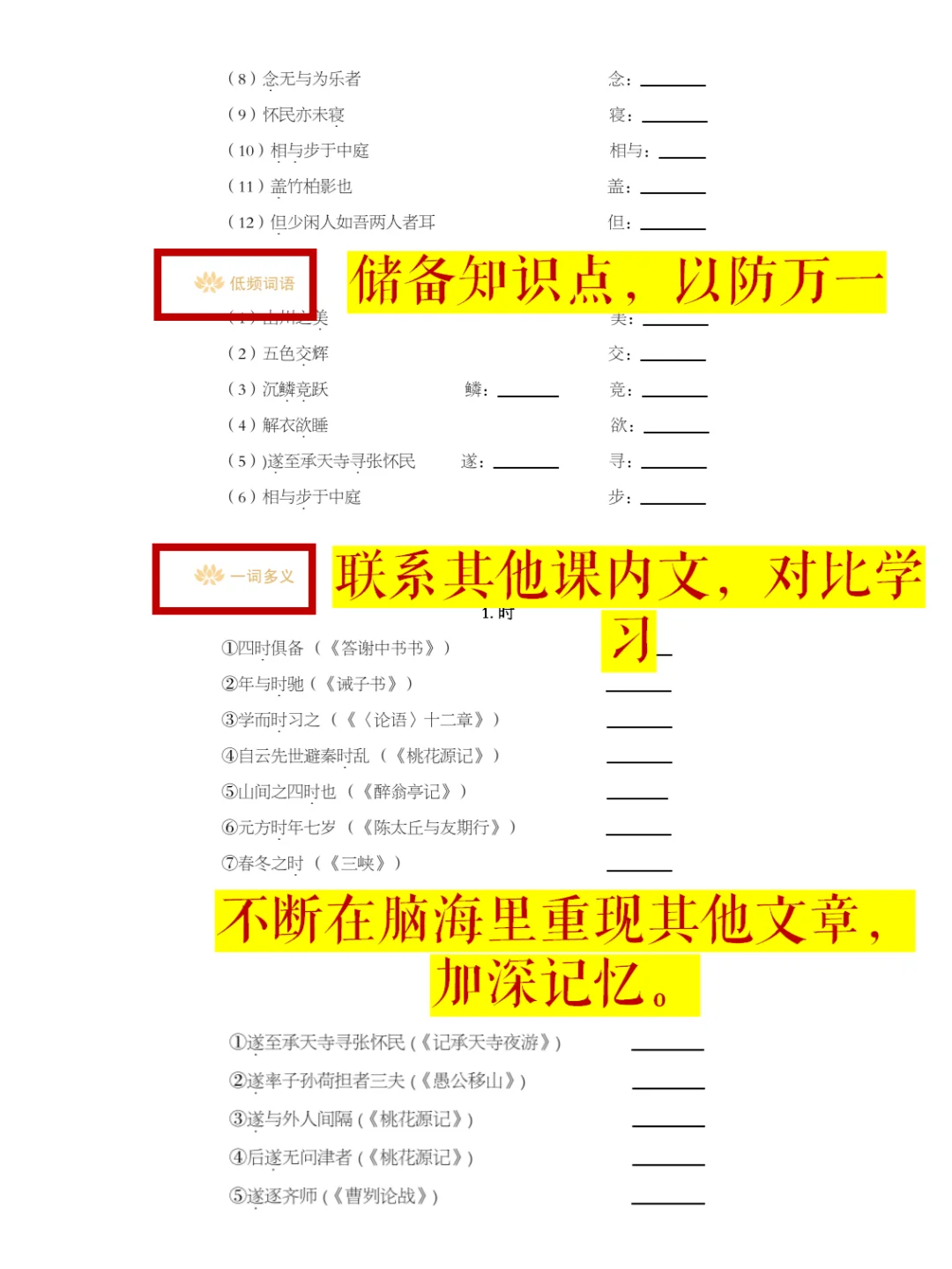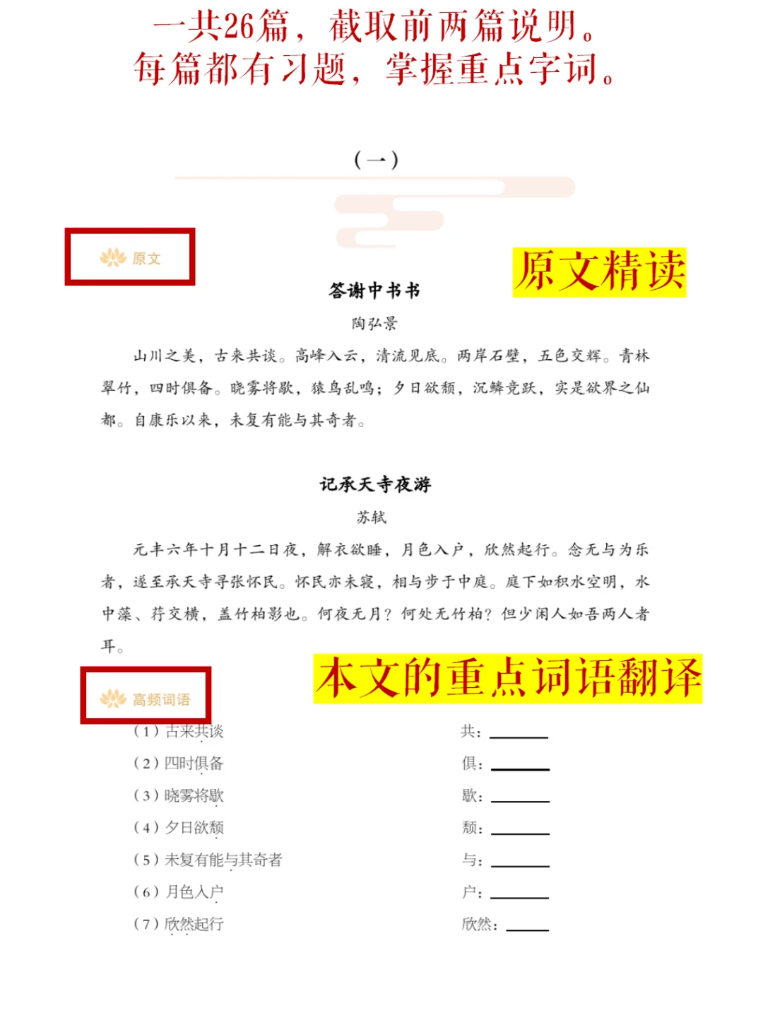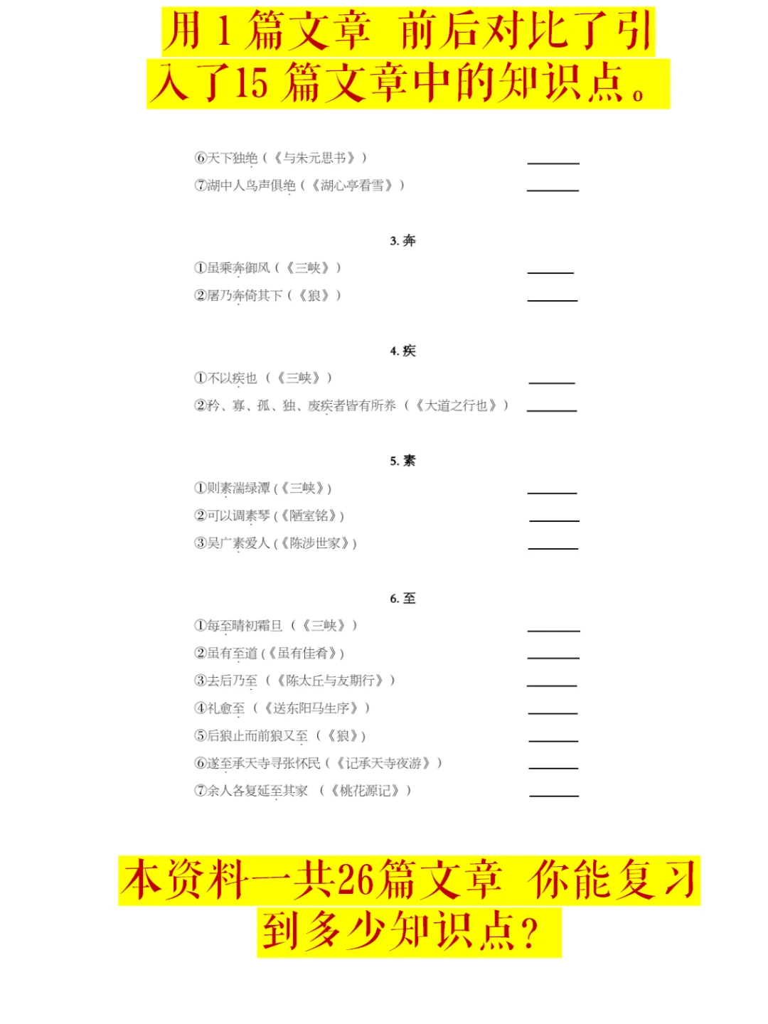 不懂就问有问必答 ❤️这篇之前发了,但是被和谐了,不能提及zhong㊙️kao,这121页课内文言文滚动复习资料,虽然只有26篇,看起来不多,但是习题设置把zhong㊙️kao高频考查文言文一网打尽,每个词语都联系初中三年所学过的所有意思,联动对比复习,形成整体思维。 ❣️适合人群:八年级暑假、九年级 💗使用方法:1周为一个学习周期,每周训练1-2篇,每篇用15分钟时间完成。