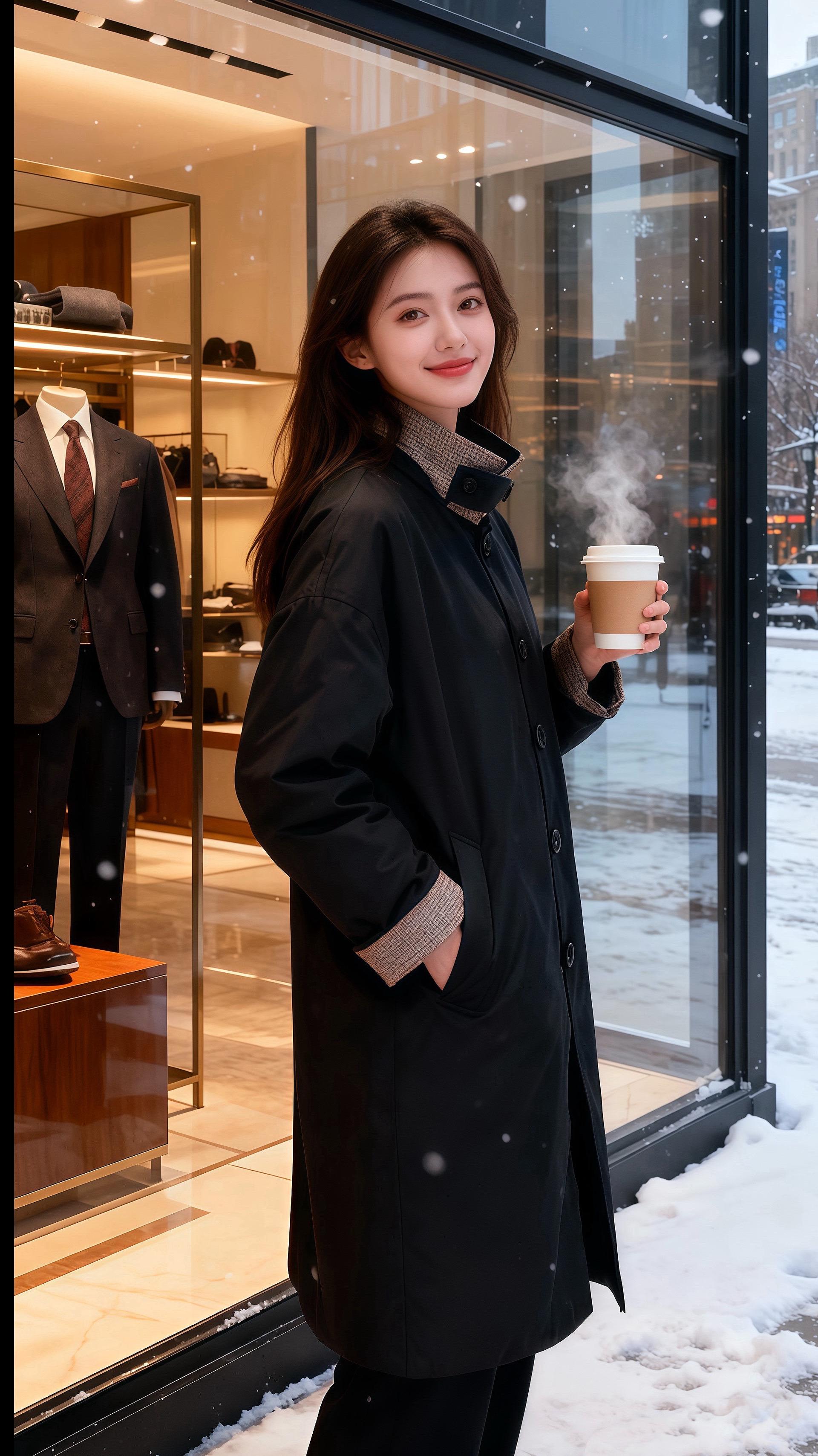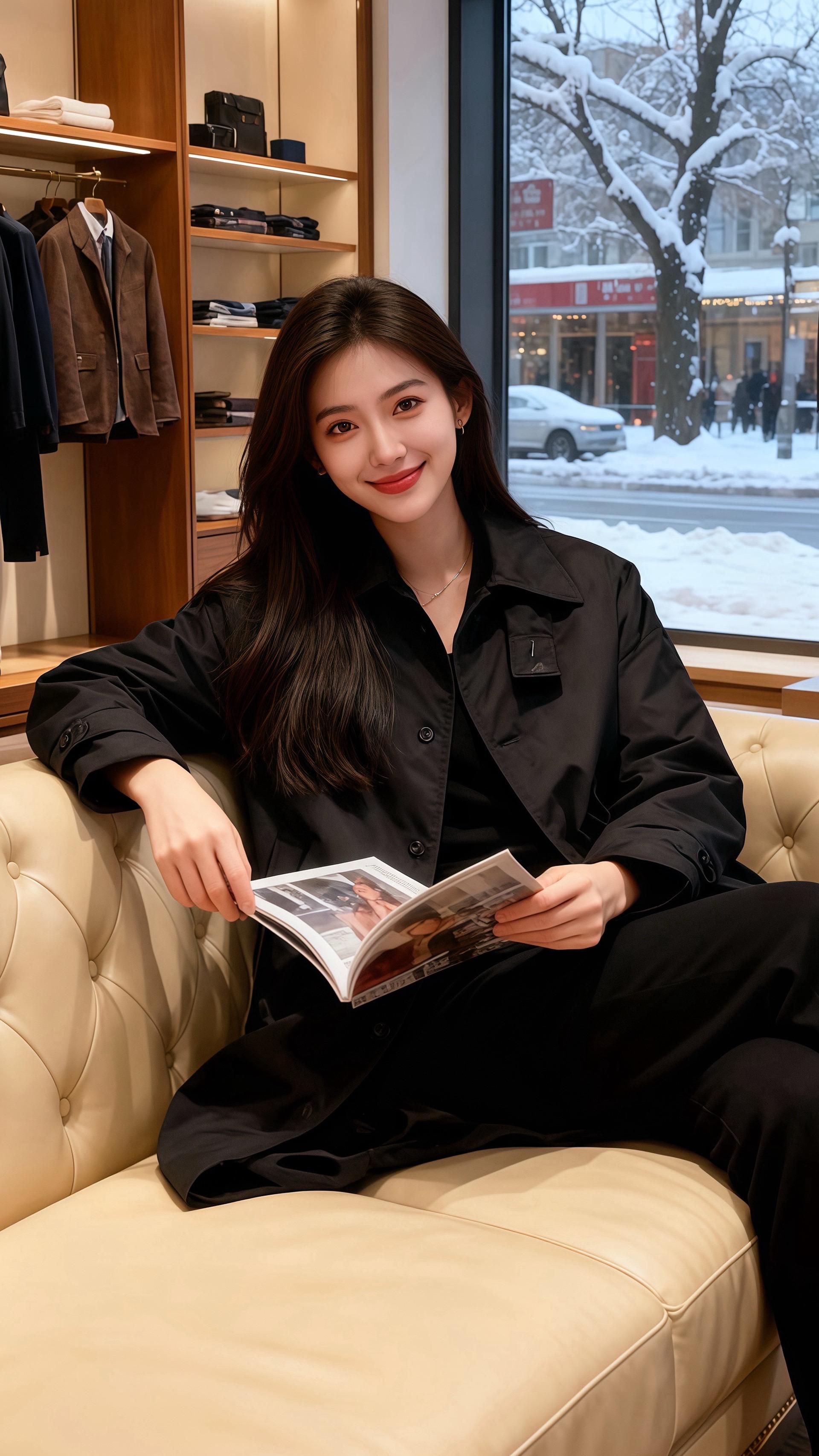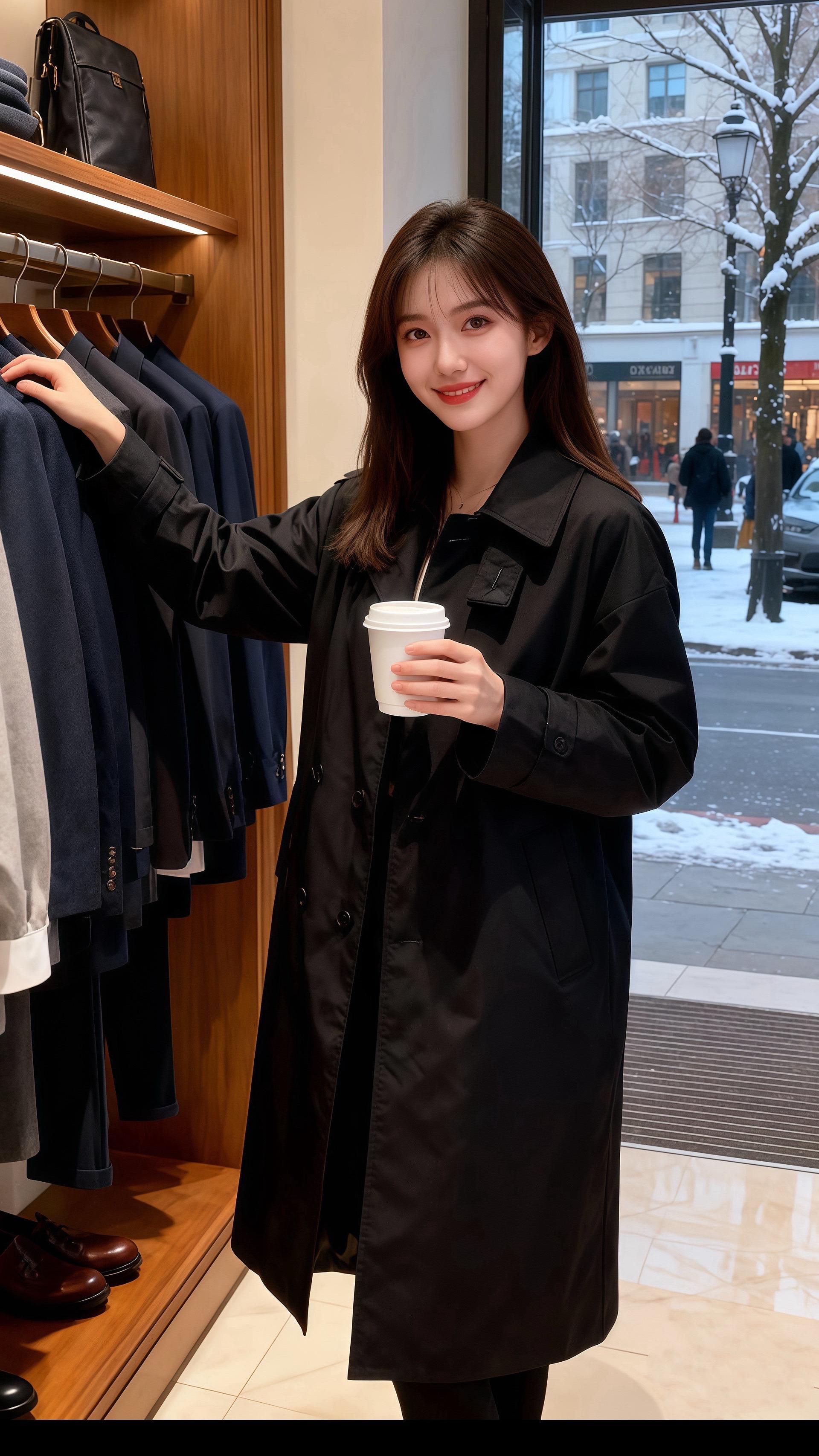 落雪裹着冷意贴在橱窗时,许妍正抱杯热拿铁倚在衣架旁翻杂志。她身上的黑风衣衬得冬日都软和——面料看着挺括却不硬,翻领刚好露出细颈,袖口的纽扣收得利落,配着黑裤,松弛里裹着温温的质感。