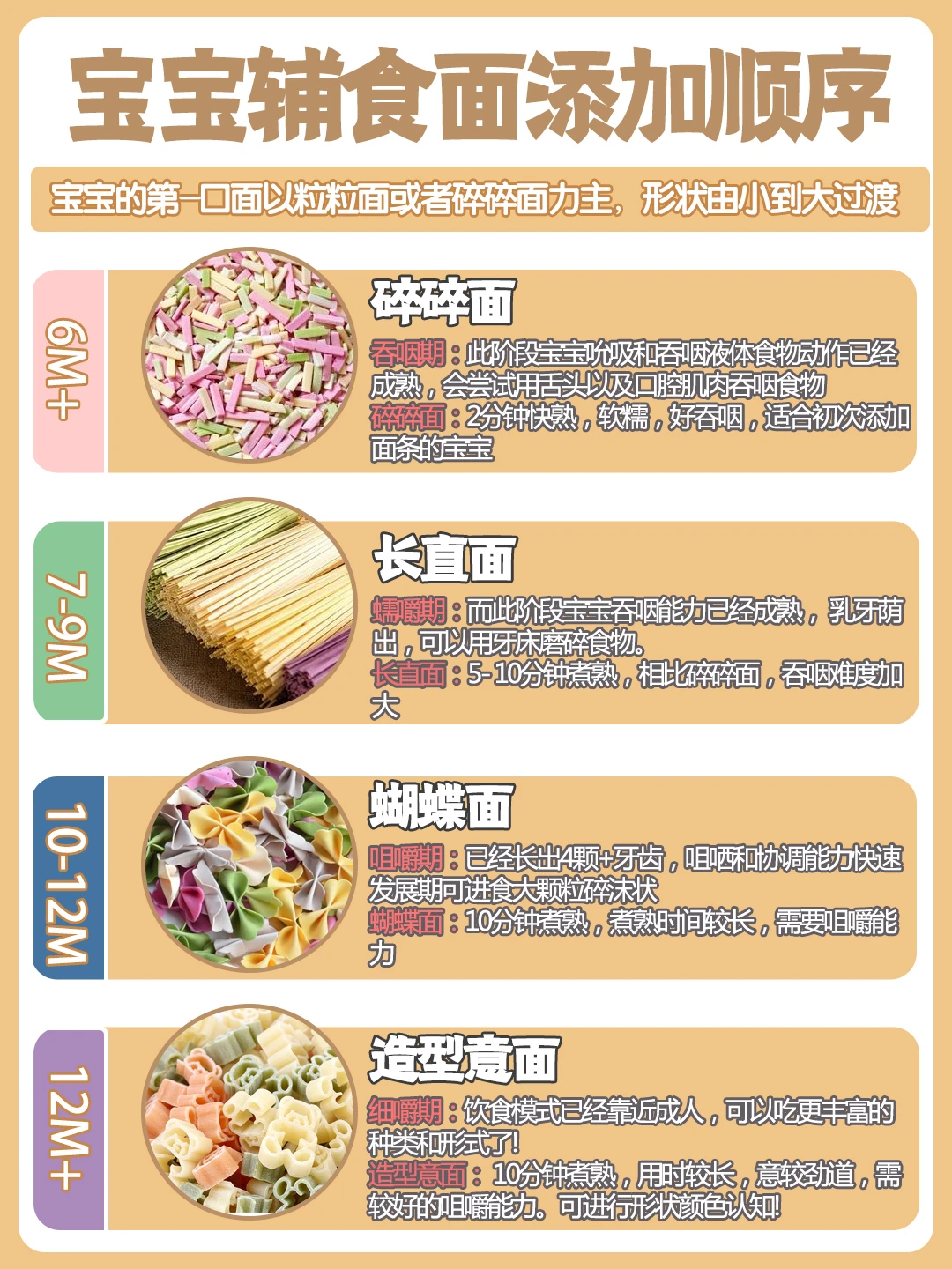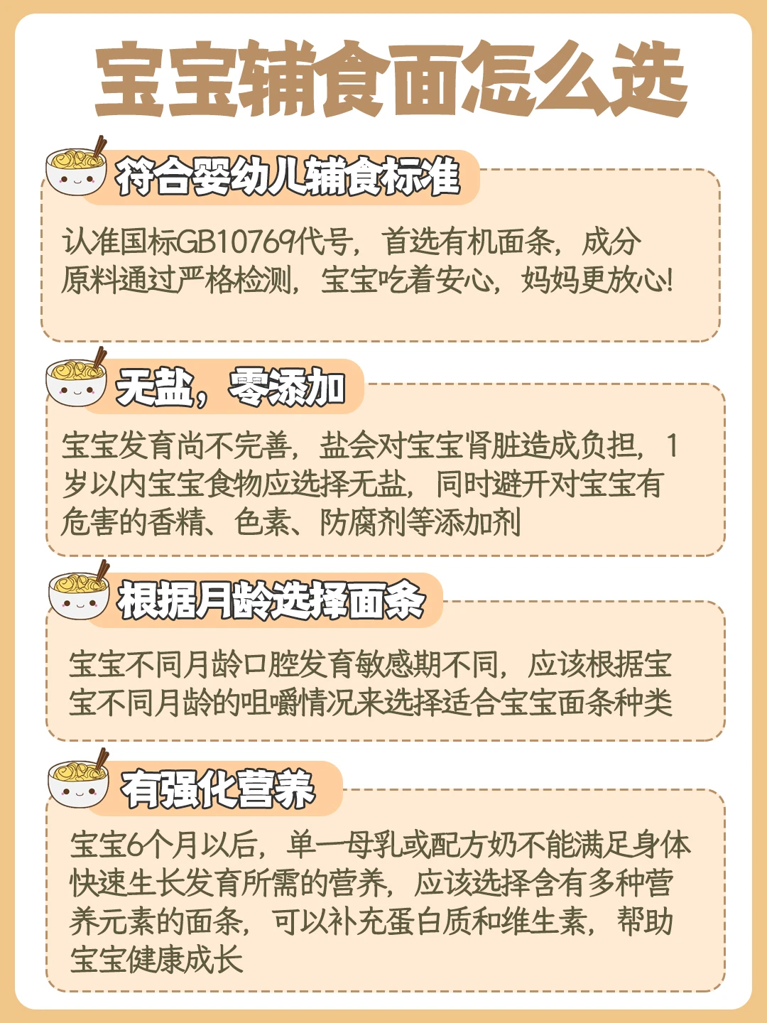 🔻第1⃣️口宝宝面怎么选,从宝宝面的种类来挑选的话,建议选择粒粒面或碎碎面作为第1⃣️口面,方便宝宝吞咽,之后再过渡到长一点的直面或造型面。2⃣️岁以内不加盐,0⃣️钠的更好