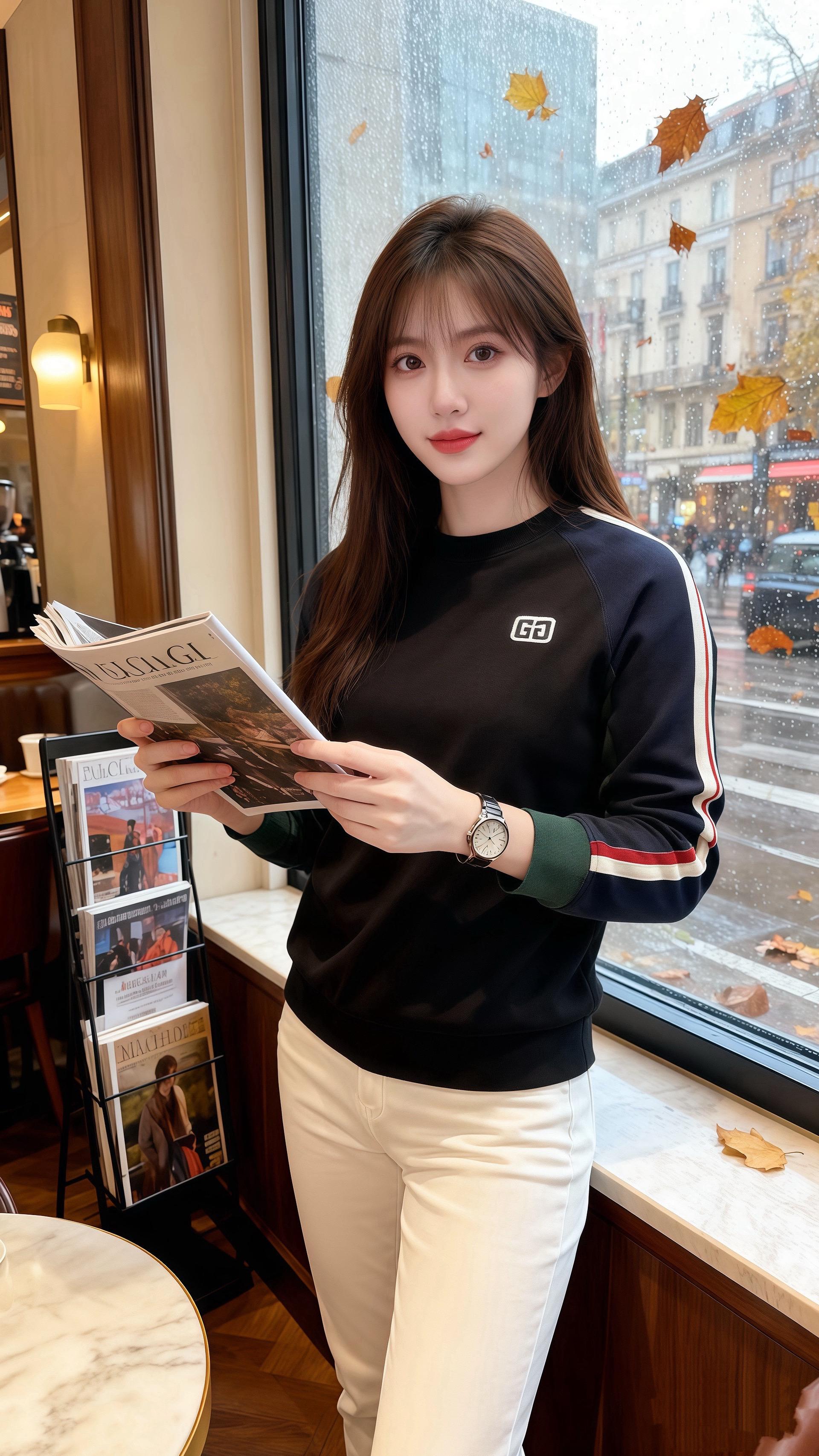 她穿件黑底撞色卫衣,藏青袖管顺着手臂弯出柔和的弧度,红绿白三条细带像把秋意折进了衣摆,胸前小小的方形标识衬得整个人利落又软和。配的白裤裹着纤细的脚踝,腕间的表链泛着细闪,像把碎雨都收进了穿搭里。